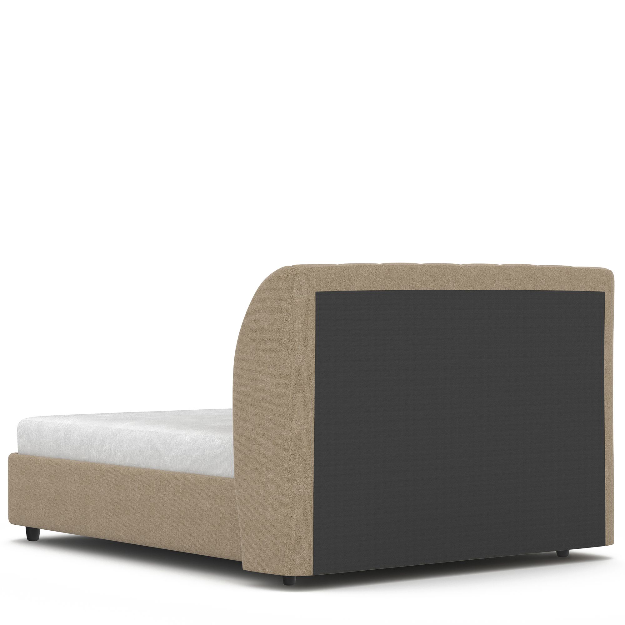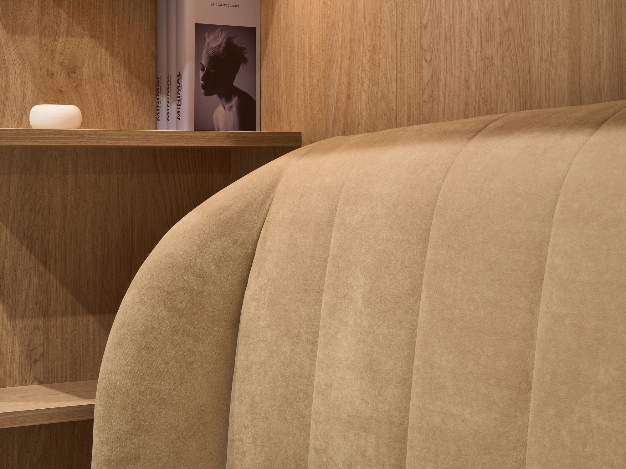 Благодаря мягкому наполнителю изголовья любители сериалов и чтения перед сном могут расположиться с комфортом. Строгая и лаконичная отделка в виде вертикальных утяжек визуально облегчает изголовье и делает его выше. Обивка кровати специально разработана по заказу бренда «Дятьково Design».