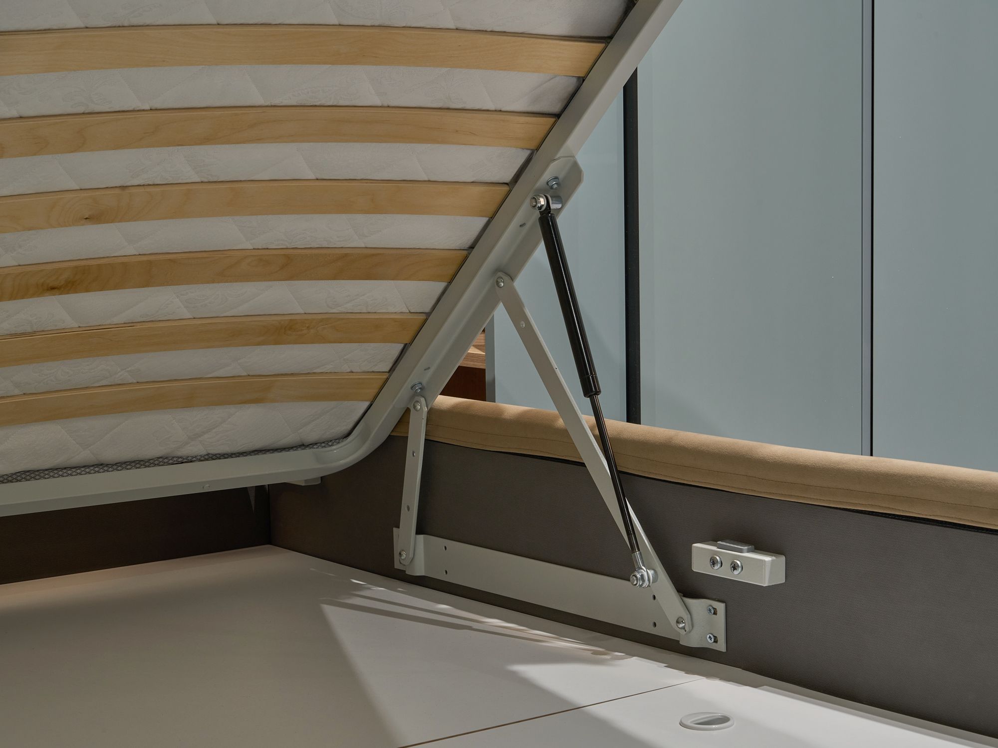 Механизм на газовых лифтах надежен и безопасен. Он плавно и бесшумно поднимает матрас, позволяя открывать ящик без особых усилий. Нагрузка на подъемный механизм – до 120 кг. Можно использовать матрас высотой до 45 см.