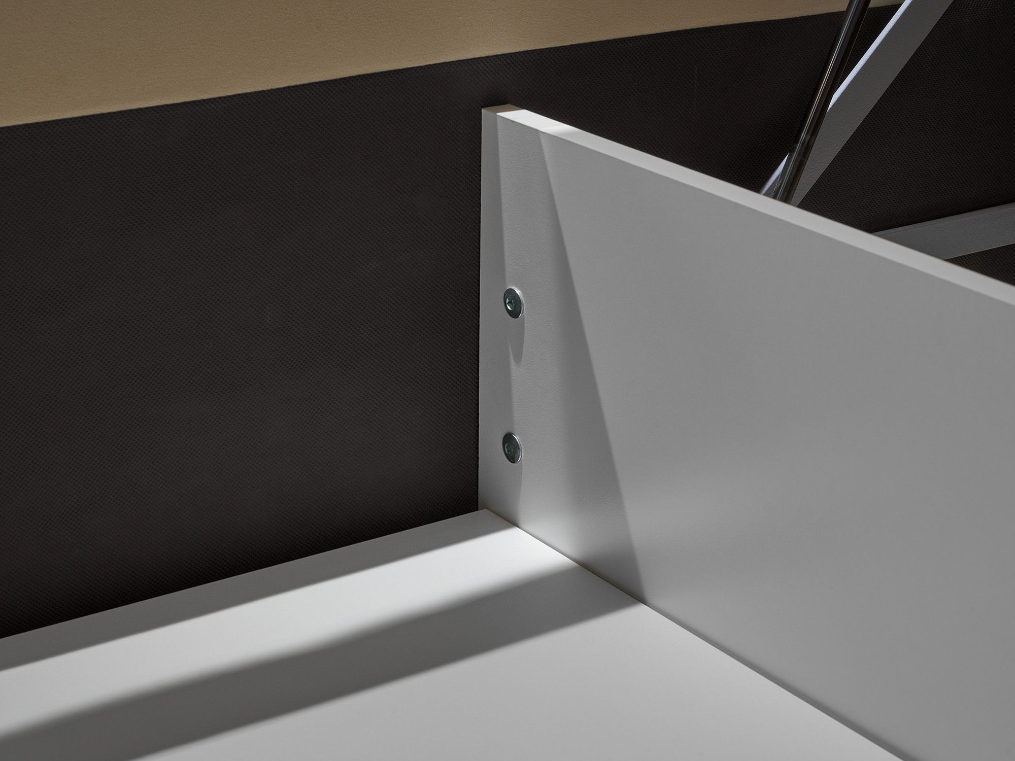 Под решеткой располагается большое (по всей площади кровати) отделение для хранения одеял, подушек, демисезонной одежды и других вещей. Конструкция с двумя секциями делает основание более прочным, а хранение – функциональным.