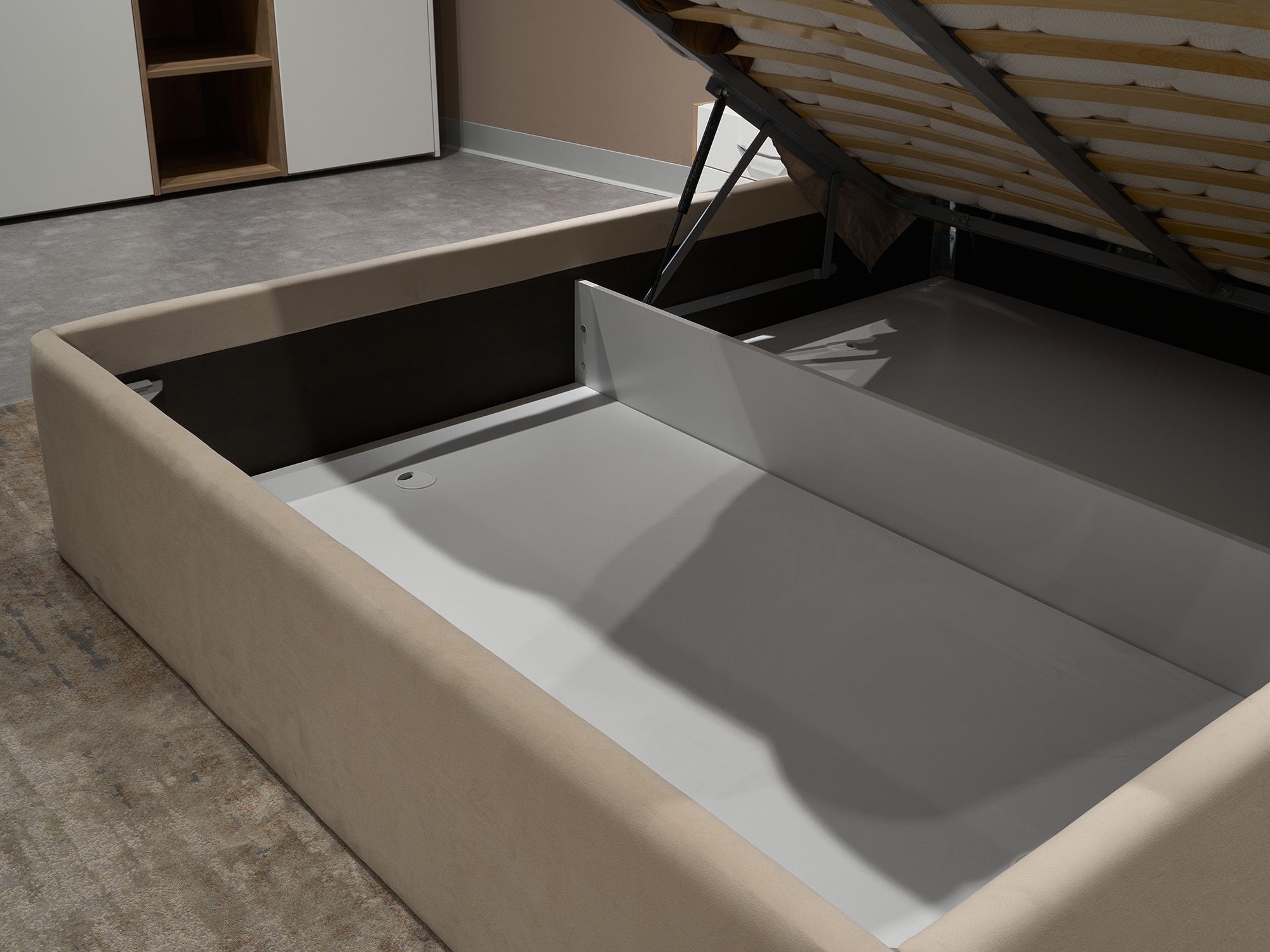 Под решеткой располагается большое (по всей площади кровати) отделение для хранения одеял, подушек, демисезонной одежды и других вещей. Конструкция с двумя секциями делает основание более прочным, а хранение – функциональным.