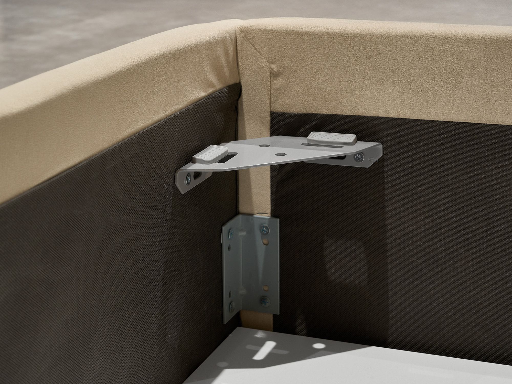 При производстве используются долговечные качественные комплектующие, фурнитура и угловые соединения, которые обеспечивают жесткое соединение царги и изножья, служат упором для ортопедического основания, гарантируют надежное крепление элементов конструкции, длительное использование и возможность многократной сборки.