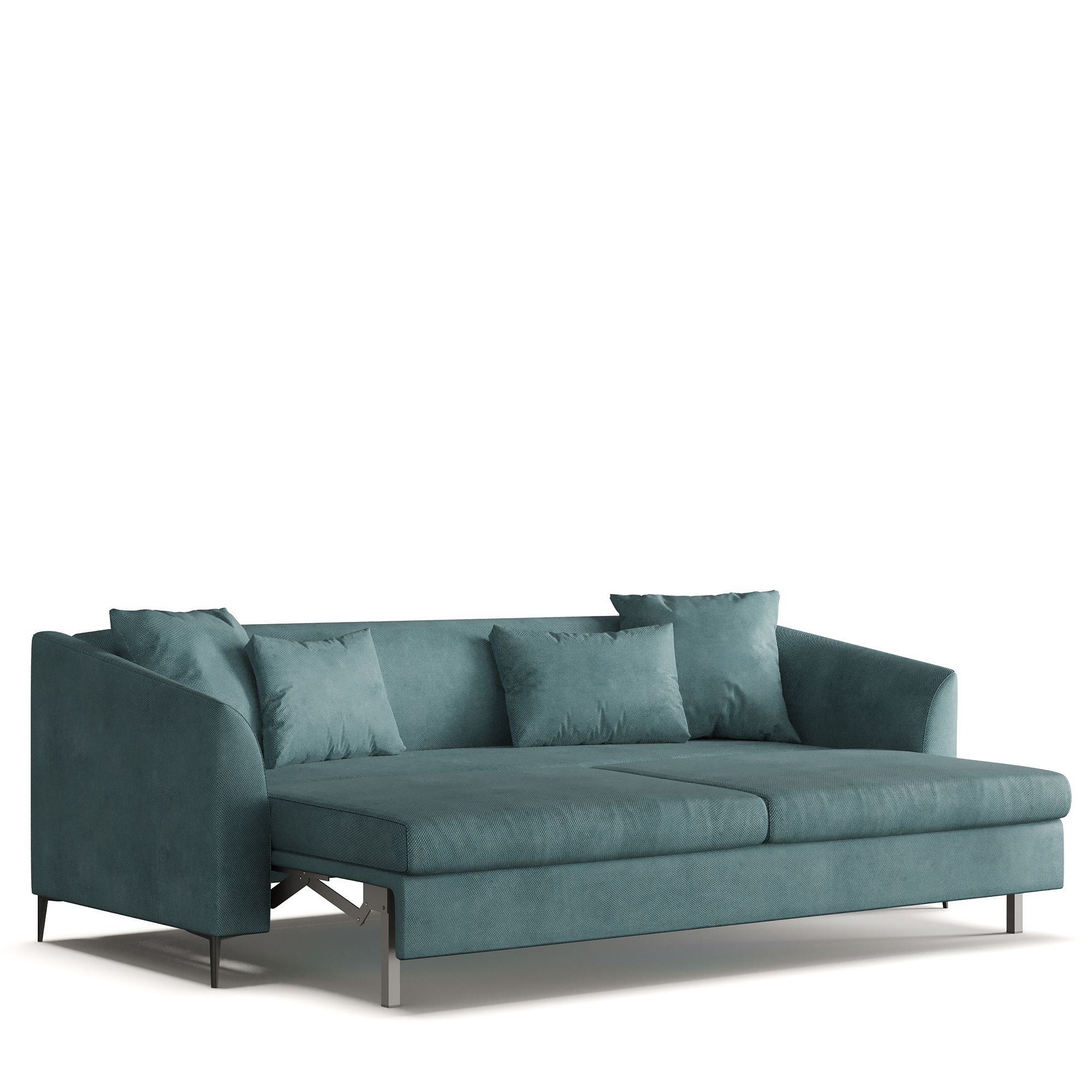 Сиденье «шагает» вверх и вперёд, вторая часть спального места поднимается из ниши вверх на уровень сиденья дивана. Способ раскладывания исключает повреждение напольного покрытия даже при ежедневной трансформации дивана.
