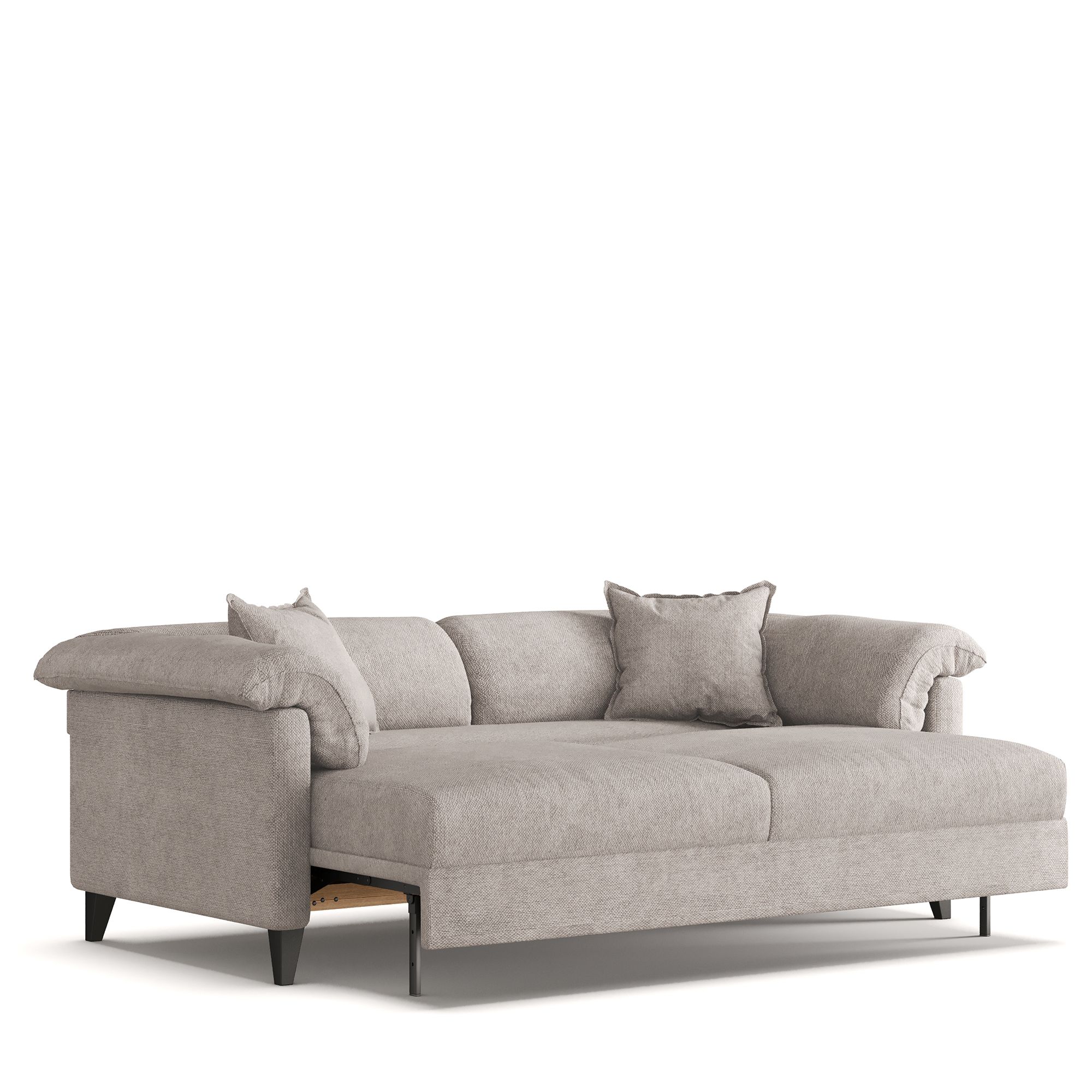 Сиденье «шагает» вверх и вперёд на пол, далее остается только сложить спинку дивана и получить широкое спальное место с небольшим стыком между двумя частями по центру. Способ раскладывания исключает повреждение напольного покрытия даже при ежедневной трансформации дивана.