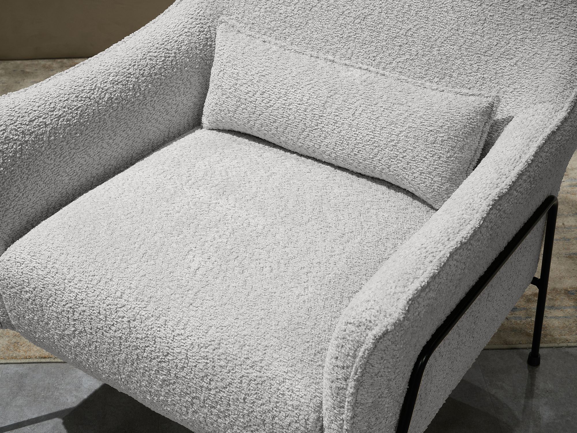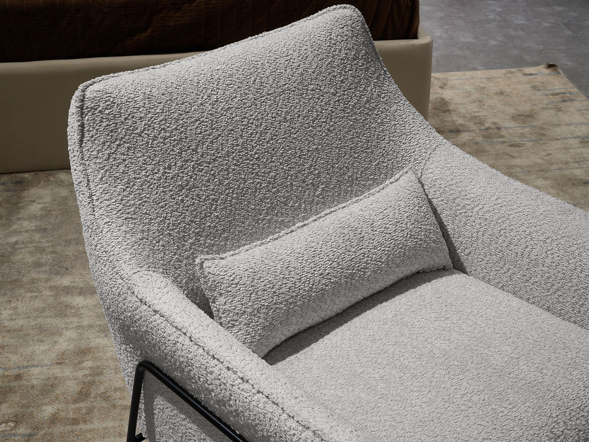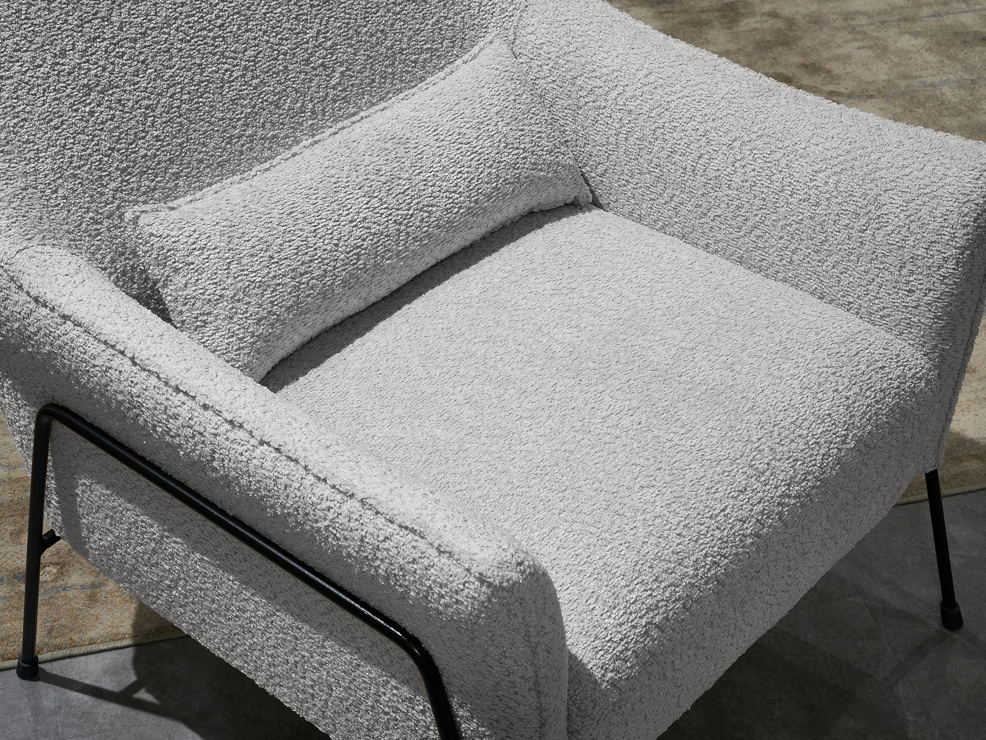Дизайнерское кресло БРЕЛА / BRELA в отделке трендовой тканью букле будто парит над полом благодаря утонченному графичному каркасу из черного металла. Аккуратный кант подчеркивает экстравагантные изгибы спинки и подлокотников. Декоративная подушка (входит в комплект) обеспечивает физиологически правильное положение позвоночника во время длительного сидения, способствует сохранению правильной осанки. В качестве наполнителя используется упругая пена, за счет которой кресло одновременно и мягкое, и хорошо держит форму.