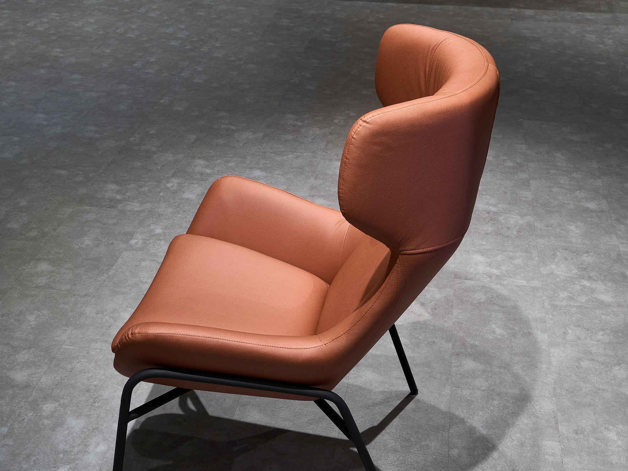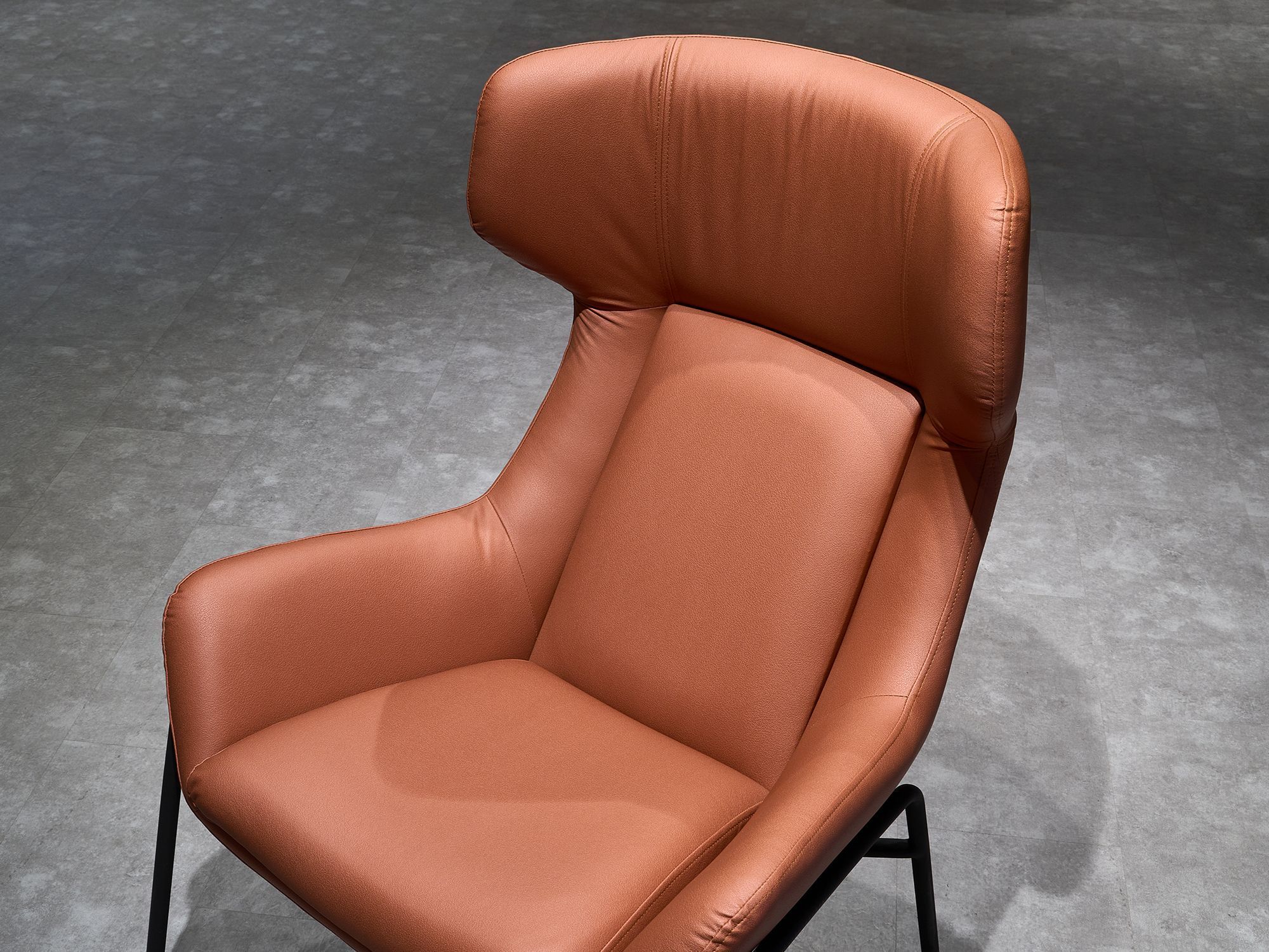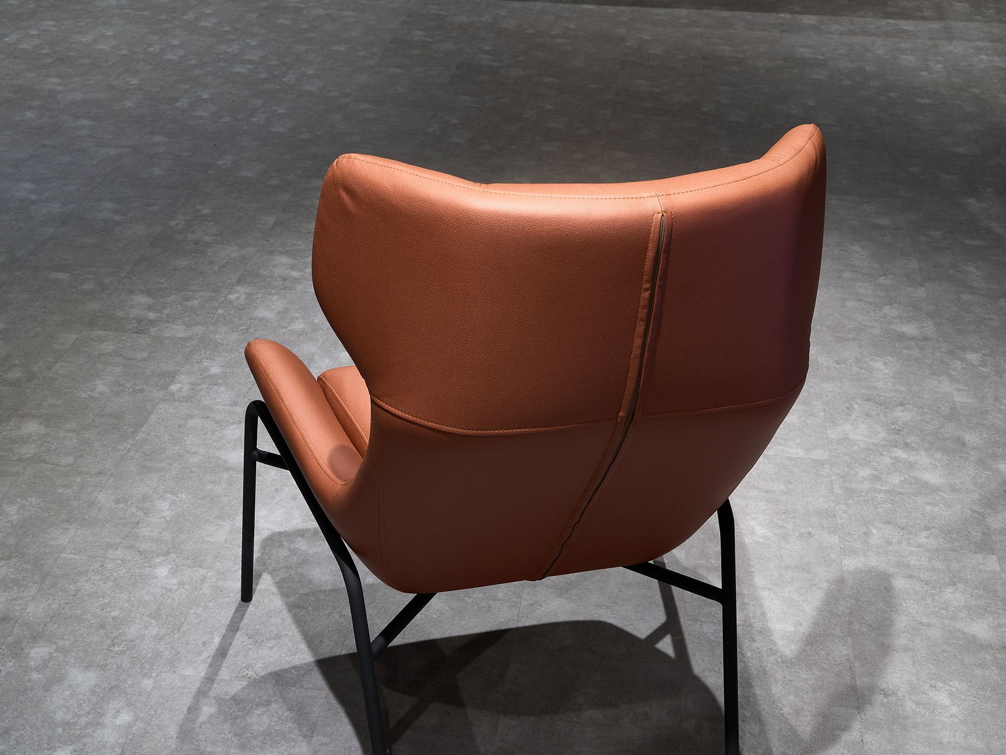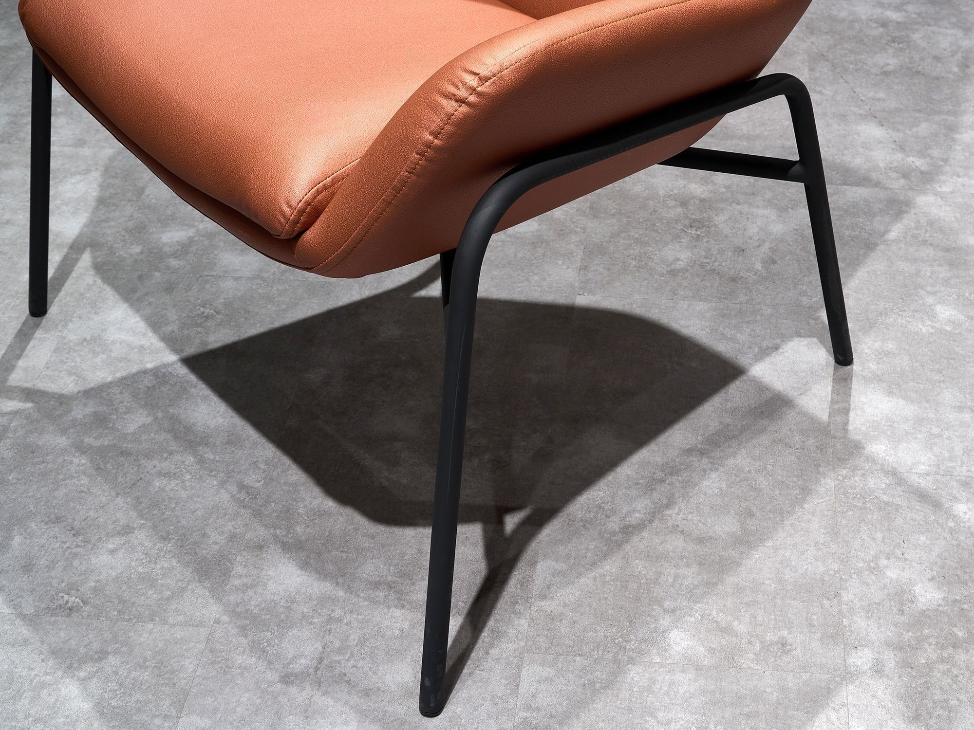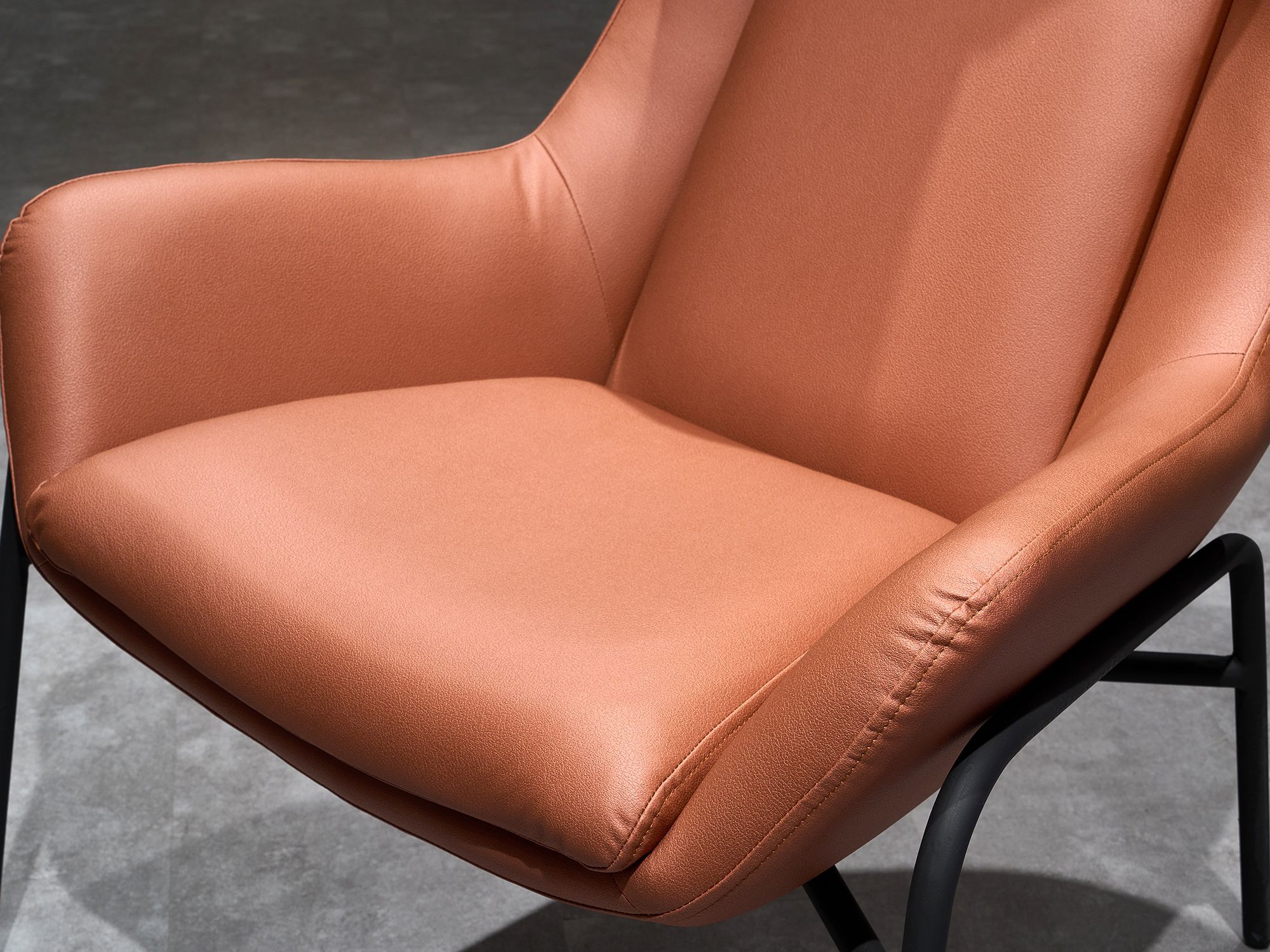 Дизайнерское кресло ГЛЕНО / GLENO в отделке экокожей базируется на металлическом каркасе и выдерживает вес до 120 кг. Высокие металлические опоры упрощают уборку, в том числе, с использованием робота-пылесоса. Спинка кресла способствует физиологически правильному положению позвоночника во время длительного сидения и сохранению правильной осанки. Узкие подлокотники обеспечивают экономию пространства и придают мебели утонченный, изысканный вид.