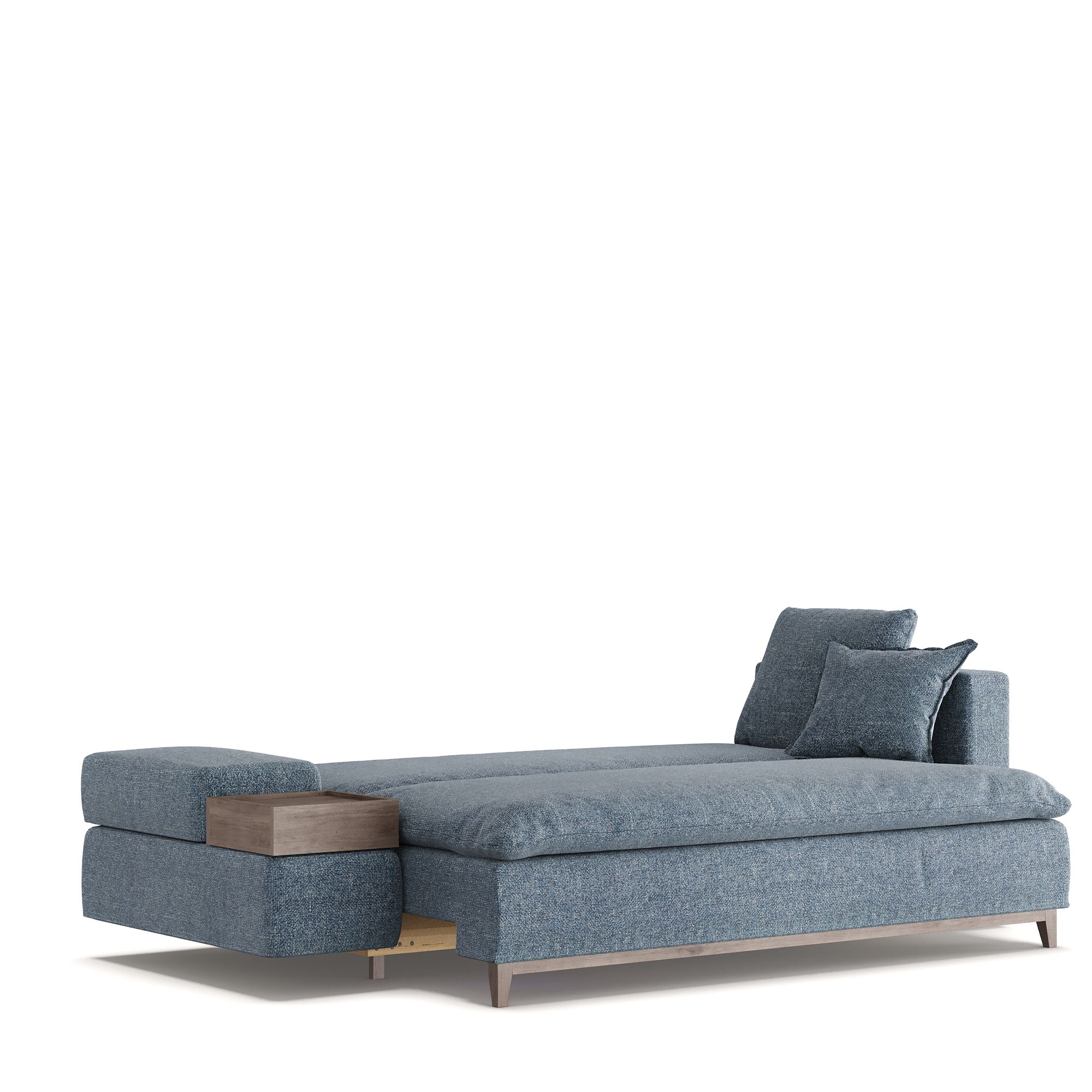 Сиденье приподнимается вверх и выкатывается вперед, после чего можно сложить спинку дивана и получить широкое спальное место с небольшим стыком между двумя частями по центру. Способ раскладывания исключает повреждение напольного покрытия даже при ежедневной трансформации дивана.