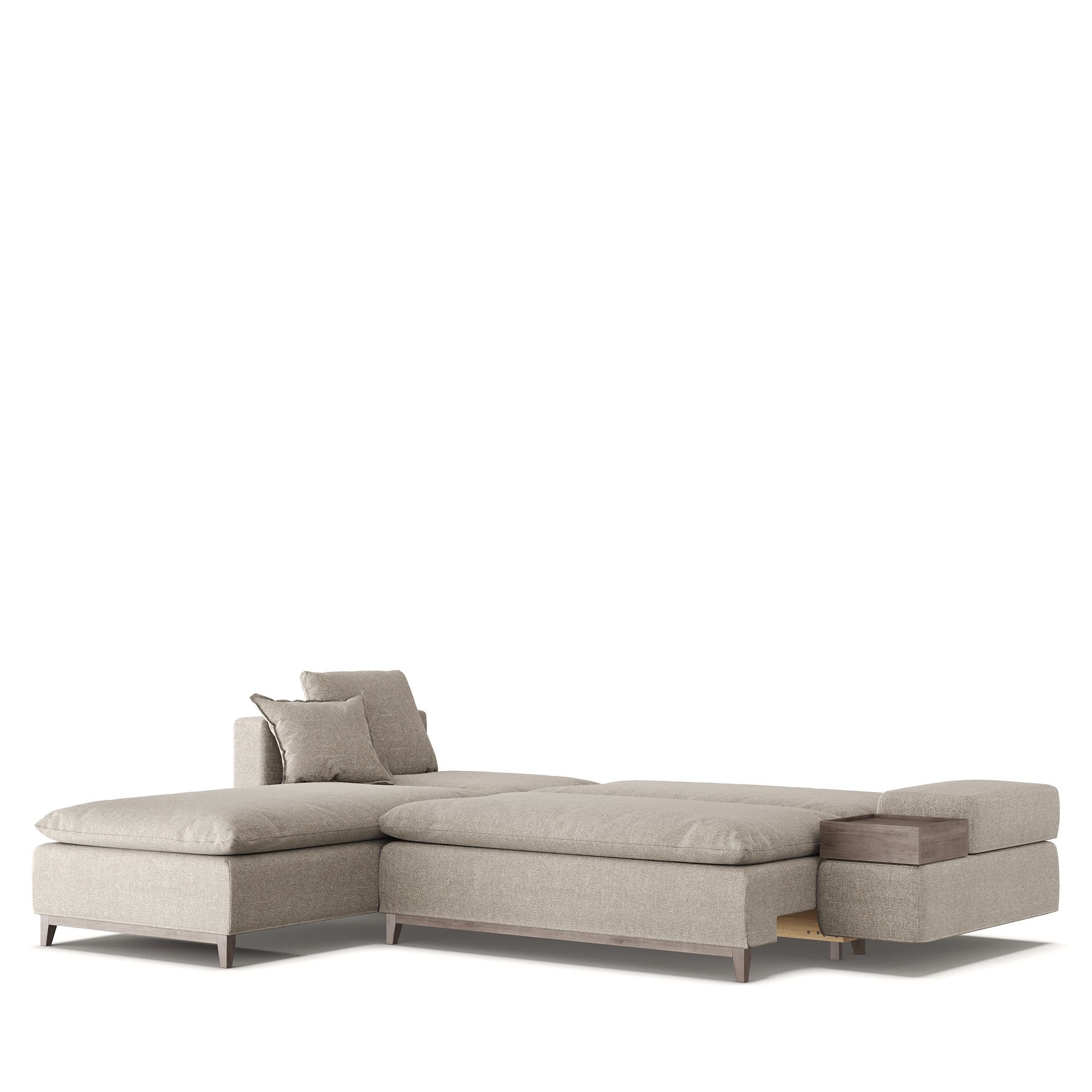 Угловой диван LANZ с левой оттоманкой оснащен широким подлокотником с ящиком для хранения. Механизм трансформации «Еврокнижка» и сбалансированный состав наполнителей позволяют использовать модель в качестве полноценного спального места. Под основанием располагается бельевой ящик.