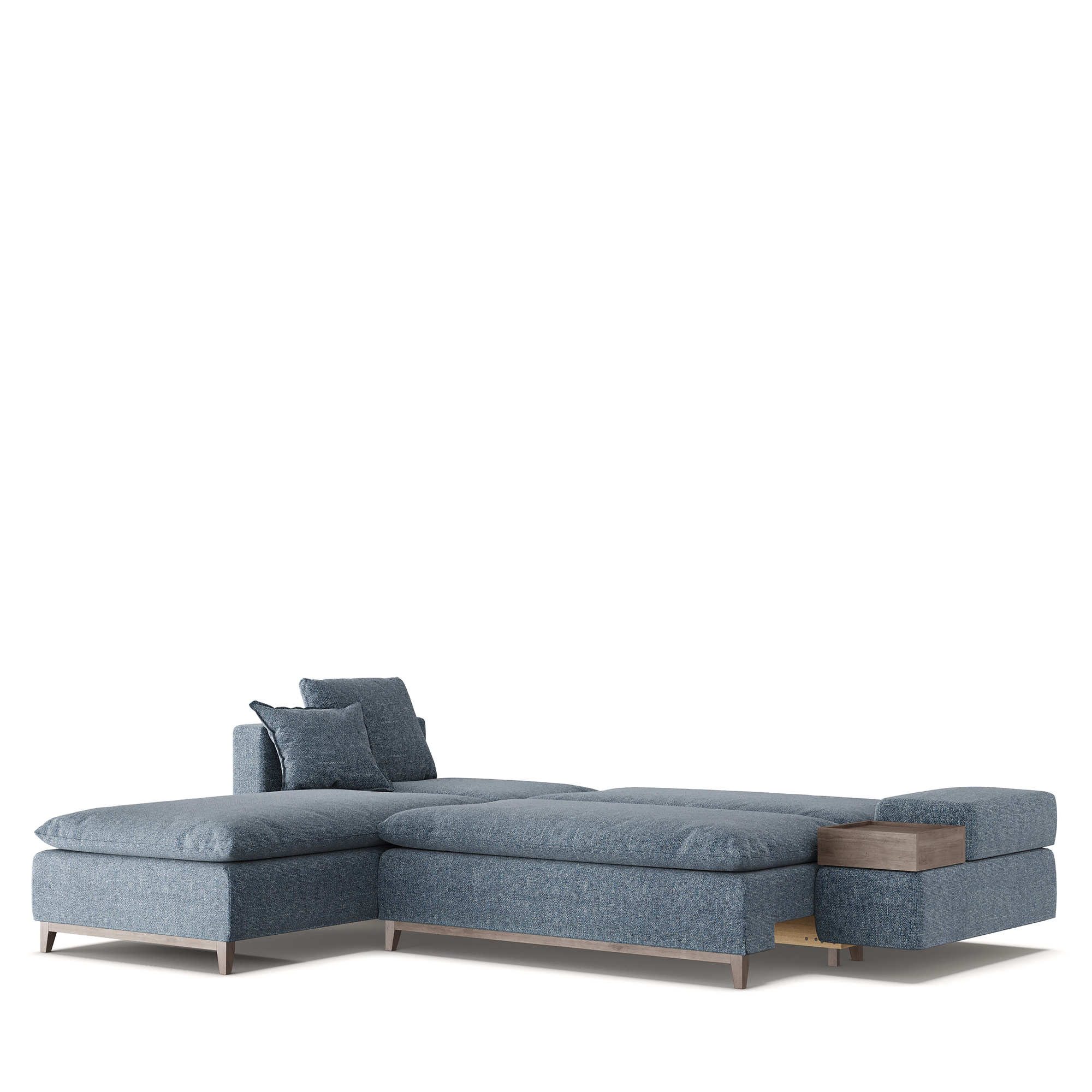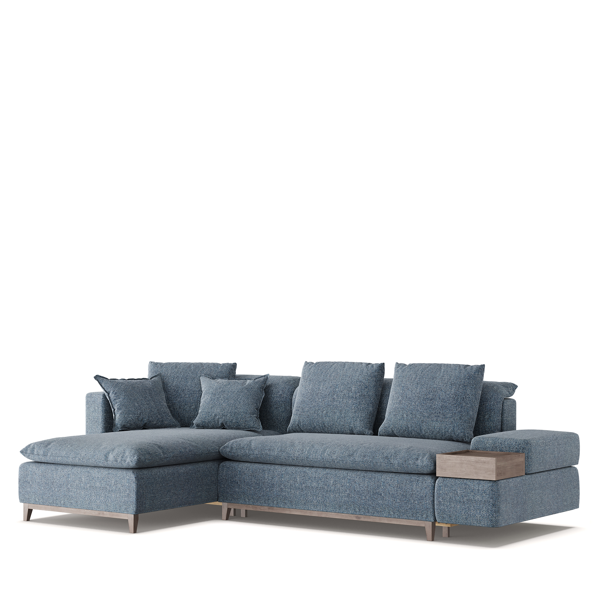 Угловой диван LANZ с левой оттоманкой оснащен широким подлокотником с ящиком для хранения. Механизм трансформации «Еврокнижка» и сбалансированный состав наполнителей позволяют использовать модель в качестве полноценного спального места. Под основанием располагается бельевой ящик. Коллекция также включает прямой модуль без подлокотников, правую оттоманку, угловой модуль и подлокотники. Используя элементы по принципу конструктора, можно создавать модульные системы различной конфигурации.