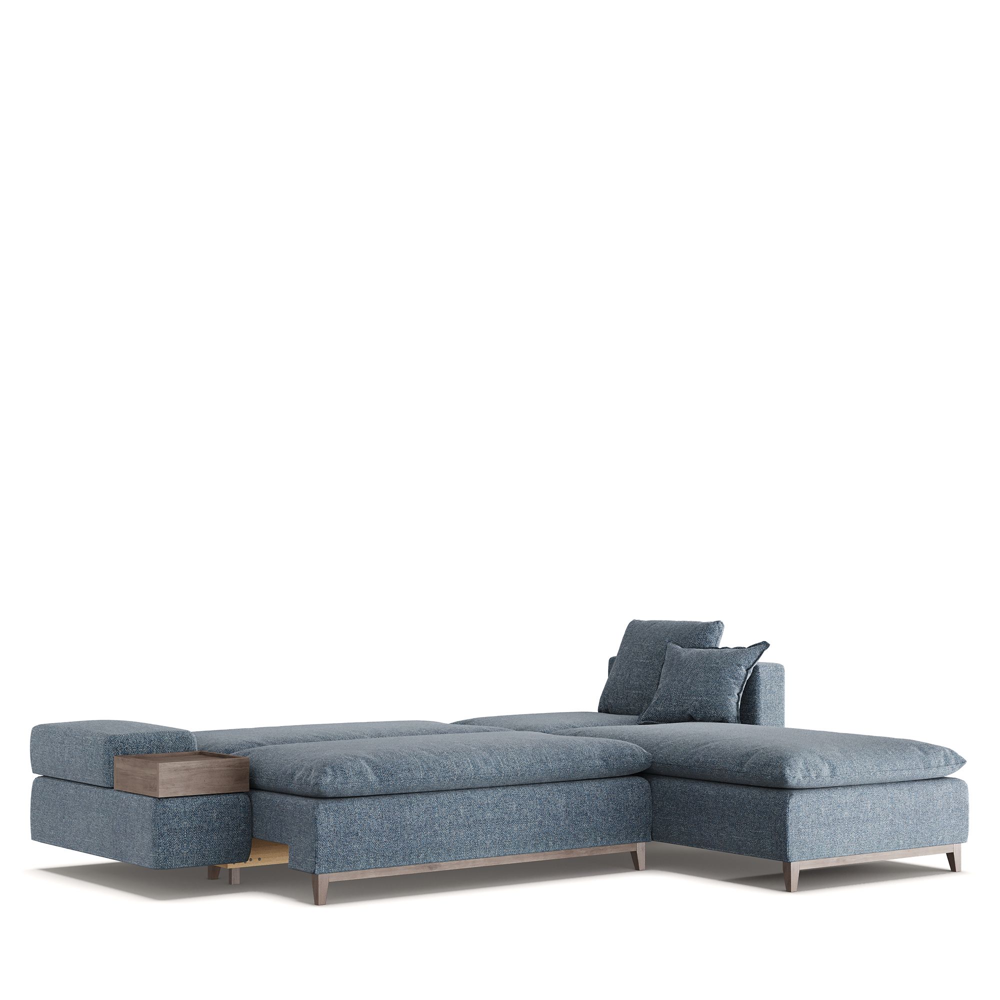 Угловой диван LANZ с правой оттоманкой оснащен широким подлокотником с ящиком для хранения. Механизм трансформации «Еврокнижка» и сбалансированный состав наполнителей позволяют использовать модель в качестве полноценного спального места. Под основанием располагается бельевой ящик. Коллекция также включает прямой модуль без подлокотников, левую оттоманку, угловой модуль и подлокотники. Используя элементы по принципу конструктора, можно создавать модульные системы различной конфигурации.