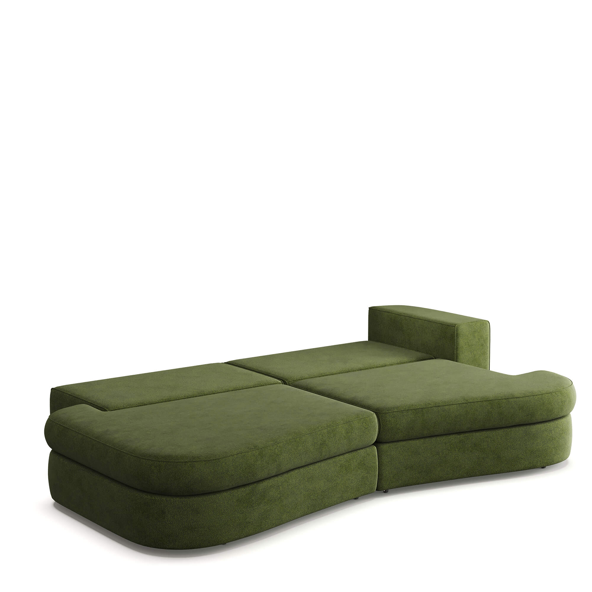 Сиденье приподнимается вверх и выкатывается вперед, после чего можно сложить спинку дивана и получить широкое спальное место с небольшим стыком между двумя частями по центру. Способ раскладывания исключает повреждение напольного покрытия даже при ежедневной трансформации дивана.