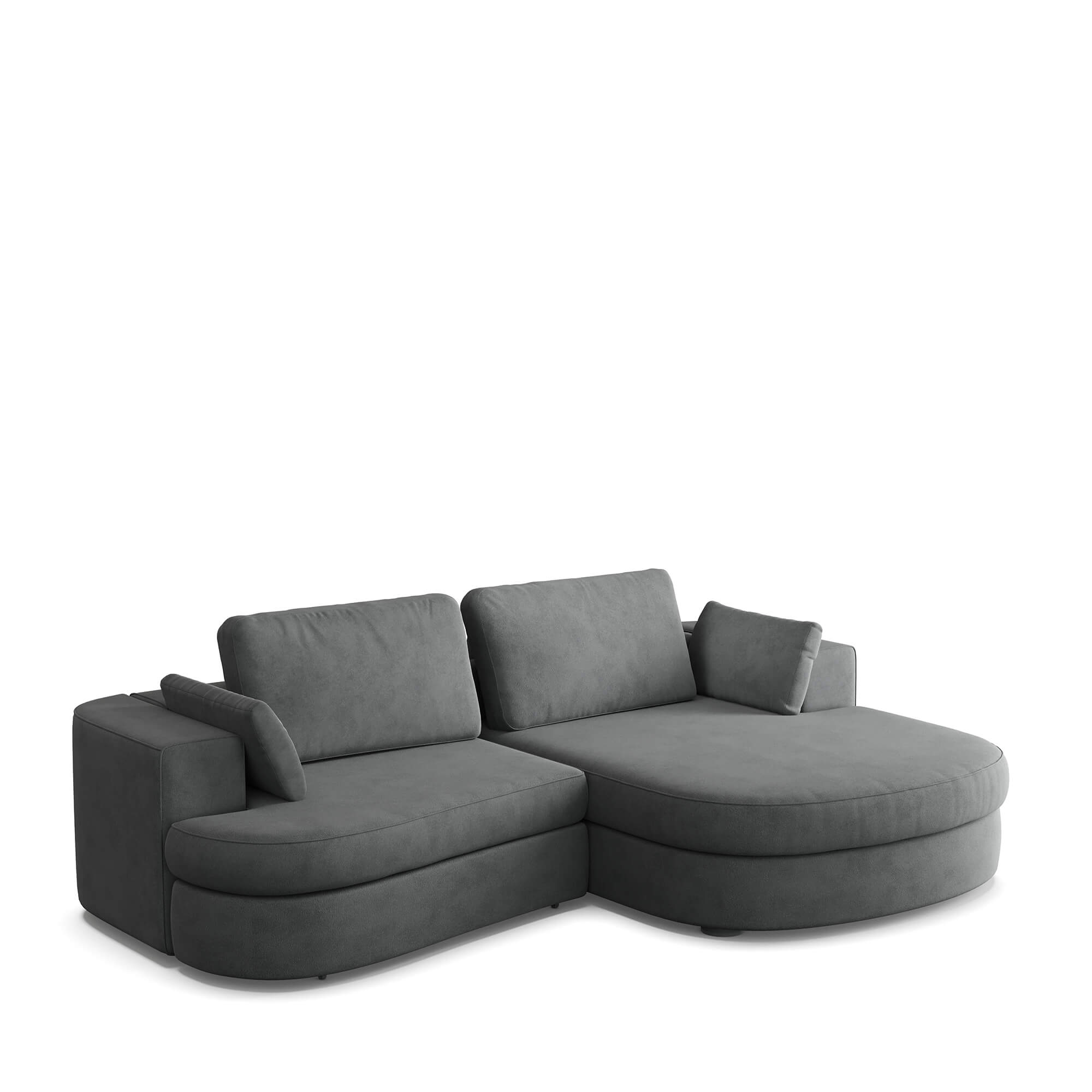 Удобный диван с низкой глубокой посадкой оснащен правой оттоманкой. В качестве материала обивки в нем используется нежный микровелюр (несколько оттенков на выбор). Диван оснащен механизмом «Еврокнижка». Его сиденье приподнимается вверх и выкатывается вперед, после чего можно сложить спинку дивана и получить широкое спальное место с небольшим стыком между двумя частями по центру. Способ раскладывания исключает повреждение напольного покрытия даже при ежедневной трансформации дивана. Модель можно использовать для ежедневного сна.