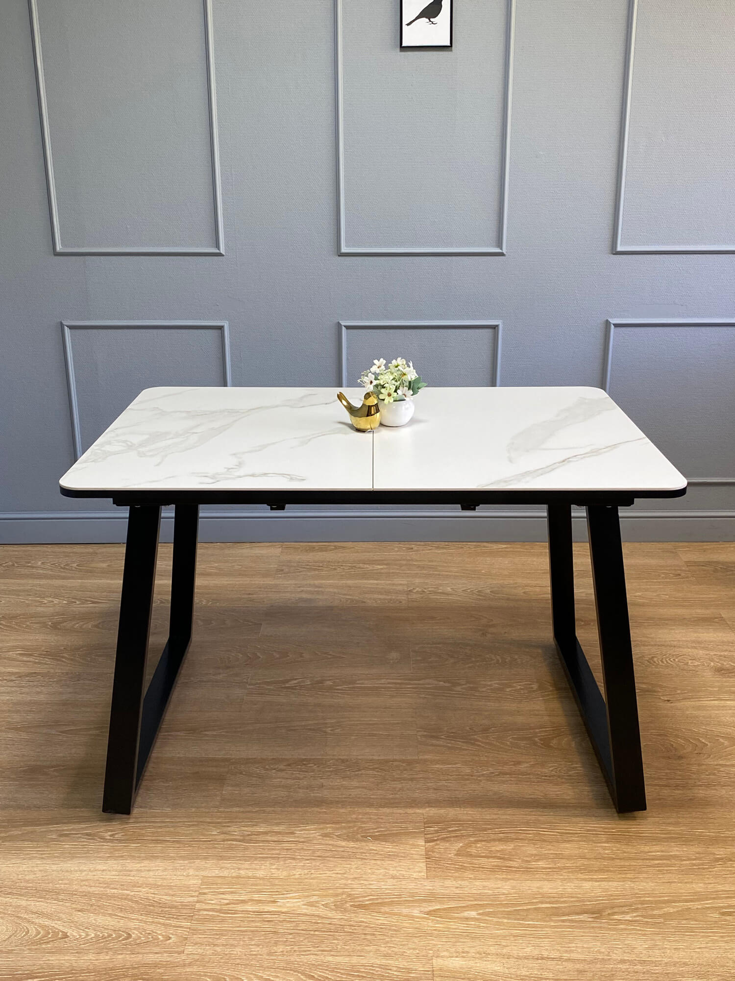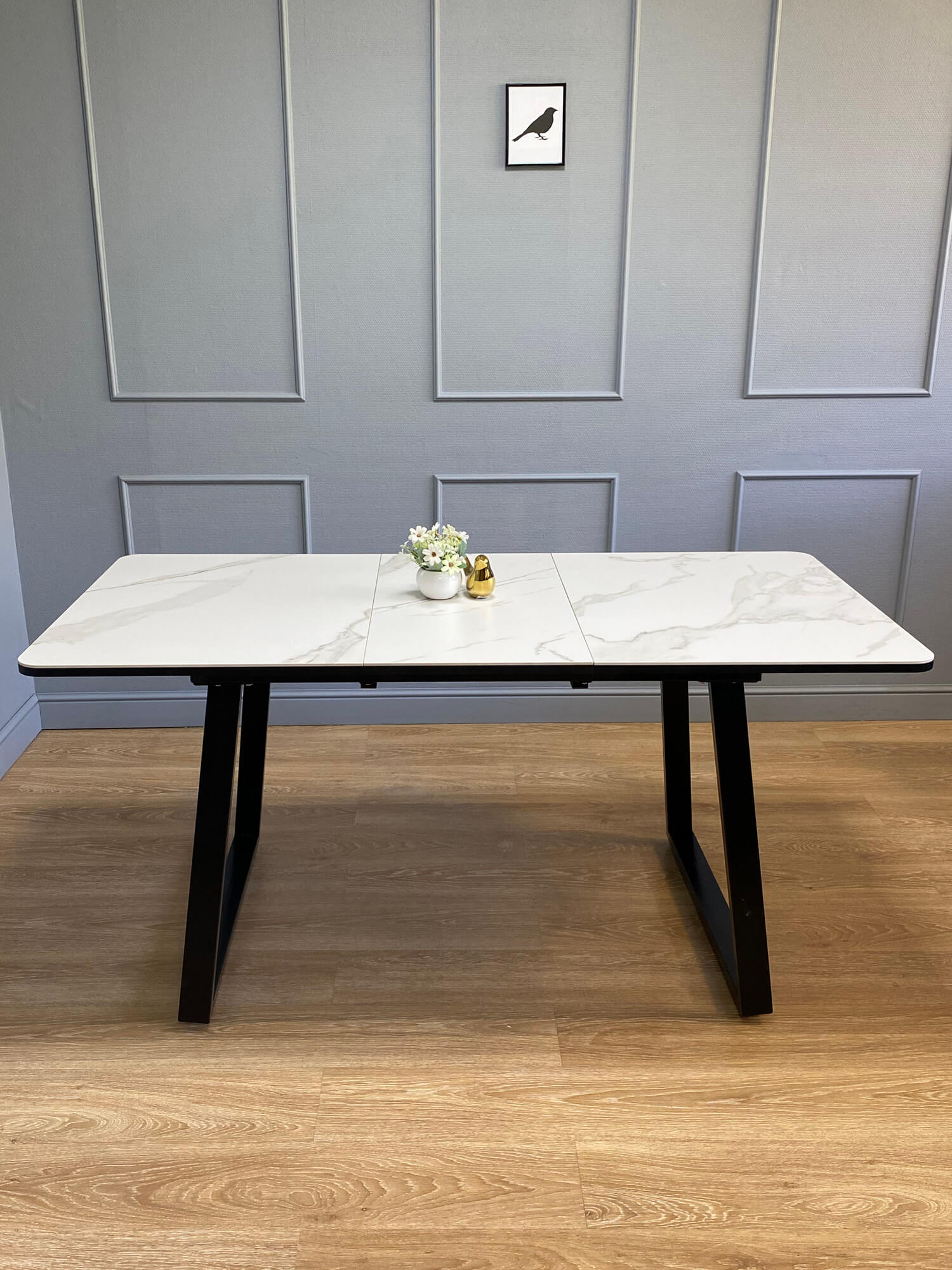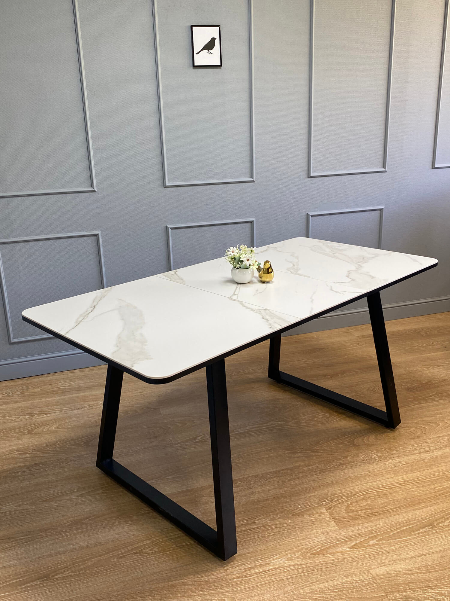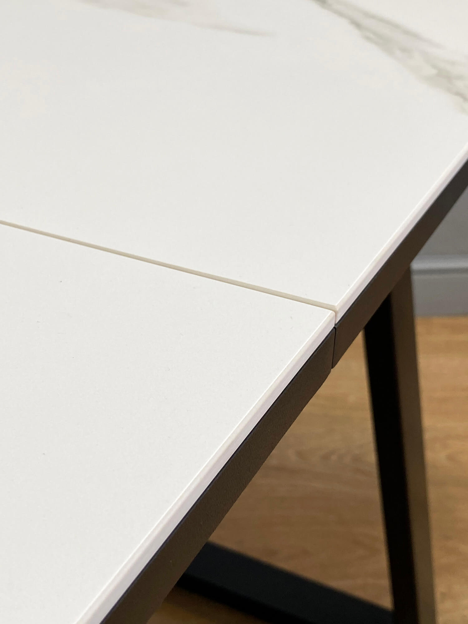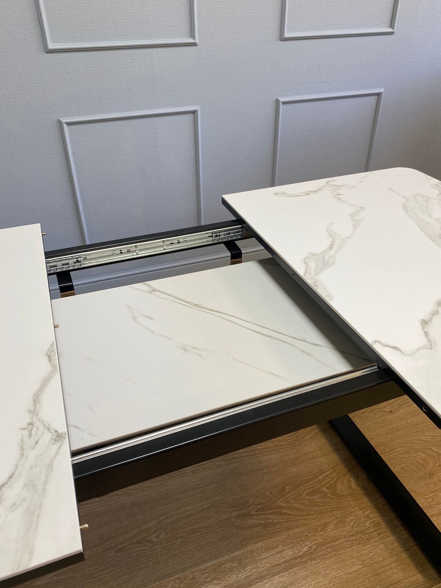 В сложенном виде стол с керамической столешницей рассчитан на 6 посадочных мест. Скругленные углы столешницы обеспечивают удобство и безопасность использования. Синхронный механизм раскладывания увеличивает длину стола на 40 см с помощю вставки, что позволяет разместить до 8 человек.