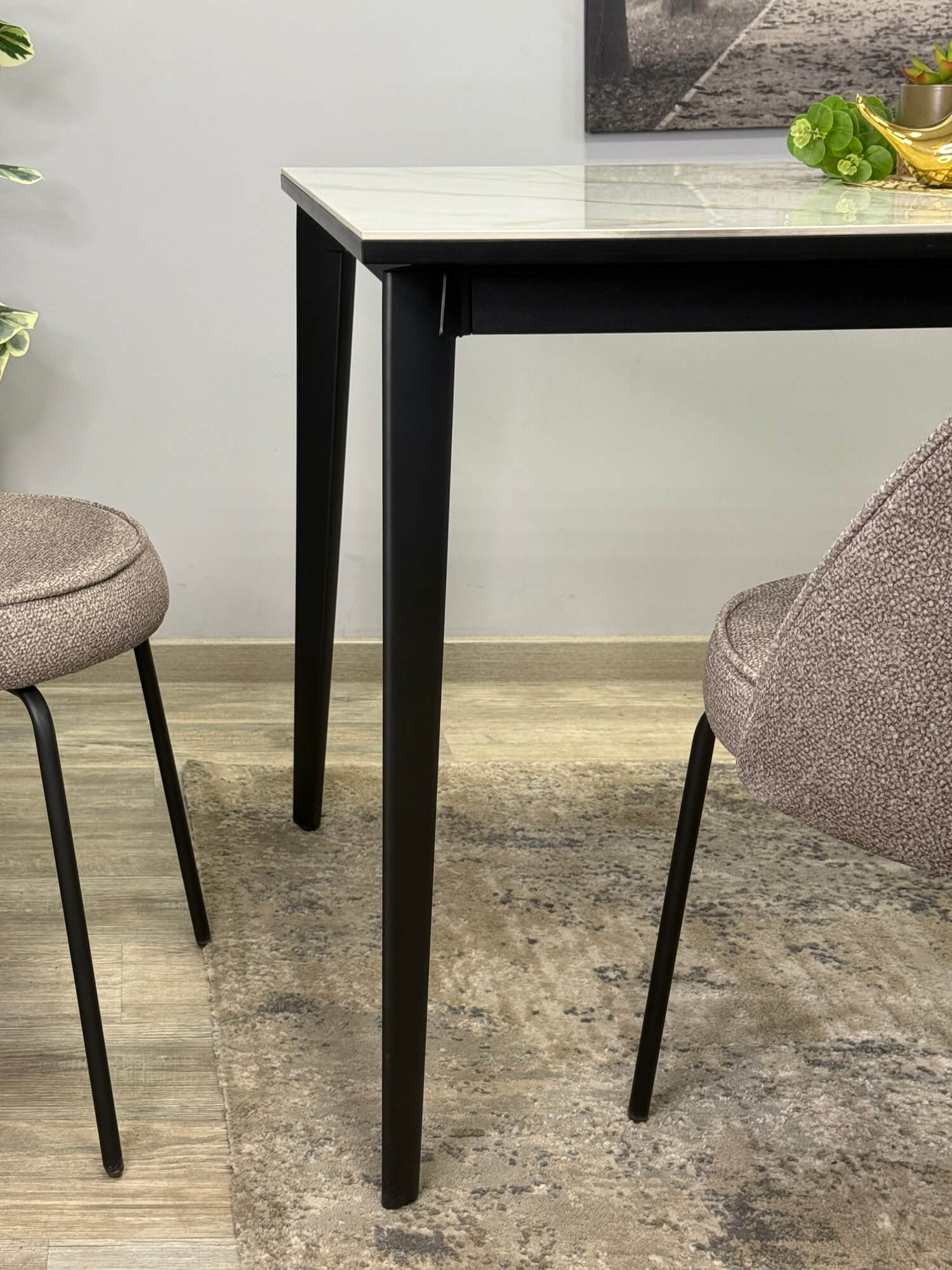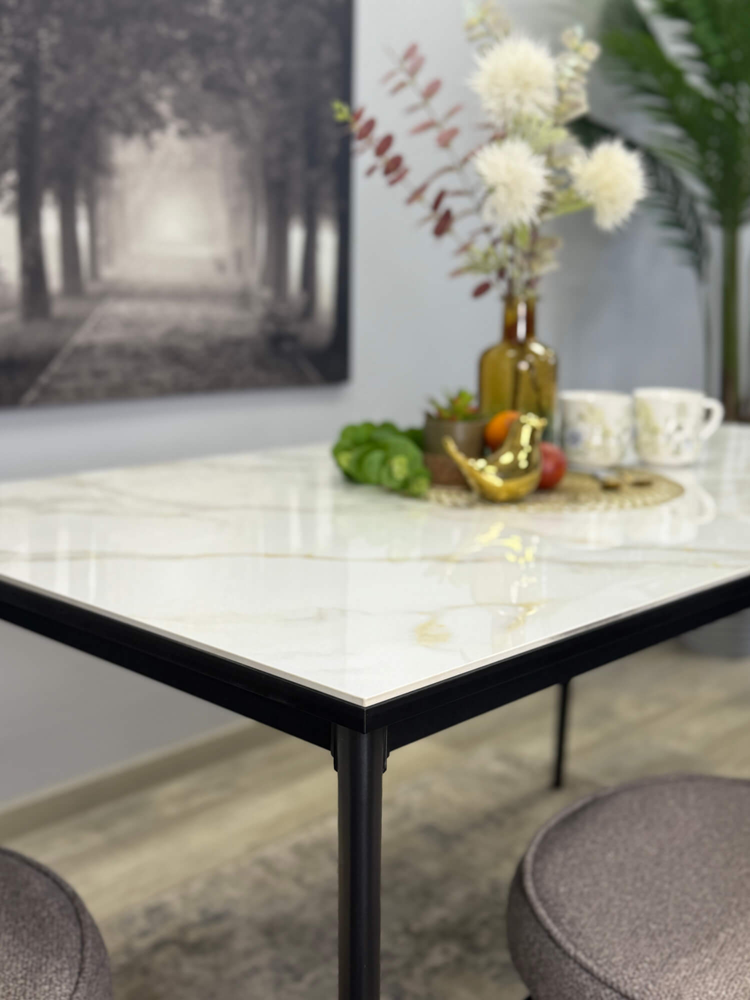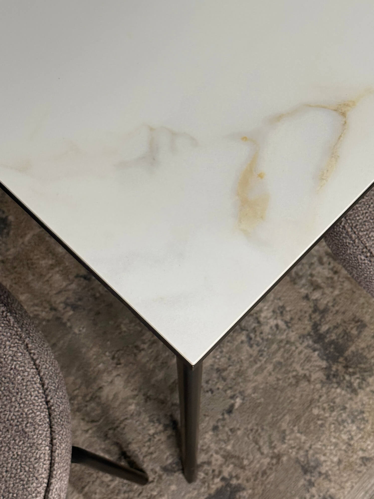 Стильный и практичный стол оснащен керамической столешницей, которая отличается высокой прочностью и долговечностью. Каркас из стального профиля оставляет достаточно места для ног, позволяя разместиться с комфортом.