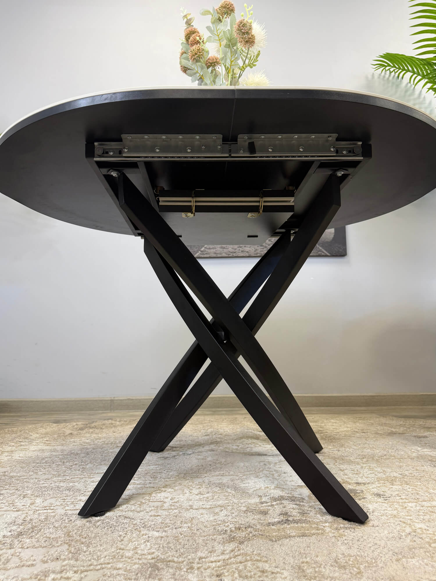 Длина овального стола в сложенном виде составляет 1,1 м. Центральное основание спроектировано так, чтобы не создавать помех при посадке, поэтому даже за сложенным столом могут разместиться до 4 человек.