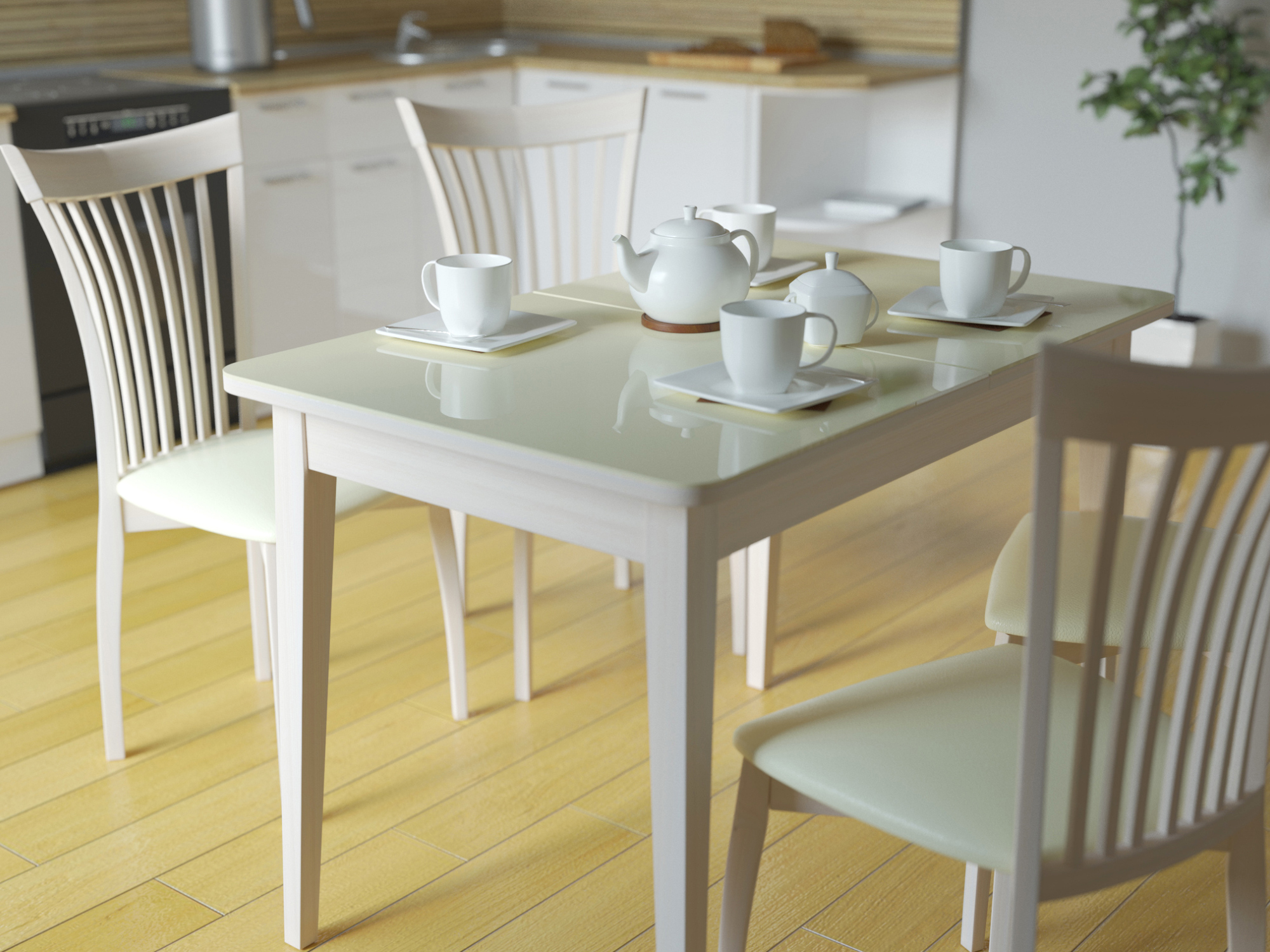 Конструкция раскладного стола позволяет поставить его вплотную к стене по любому краю. Вставка с механизмом «бабочка» выполнена из стекла в цвет столешницы. Детали выдвигаются бесшумно, с плавным скольжением по пазам. Удлинение полотна на 40 см соответствует стандартной ширине стула, что позволяет увеличить число посадочных мест с 6 до 8 (опоры не препятствуют расстановке стульев и не стесняют свободное пространство для ног).