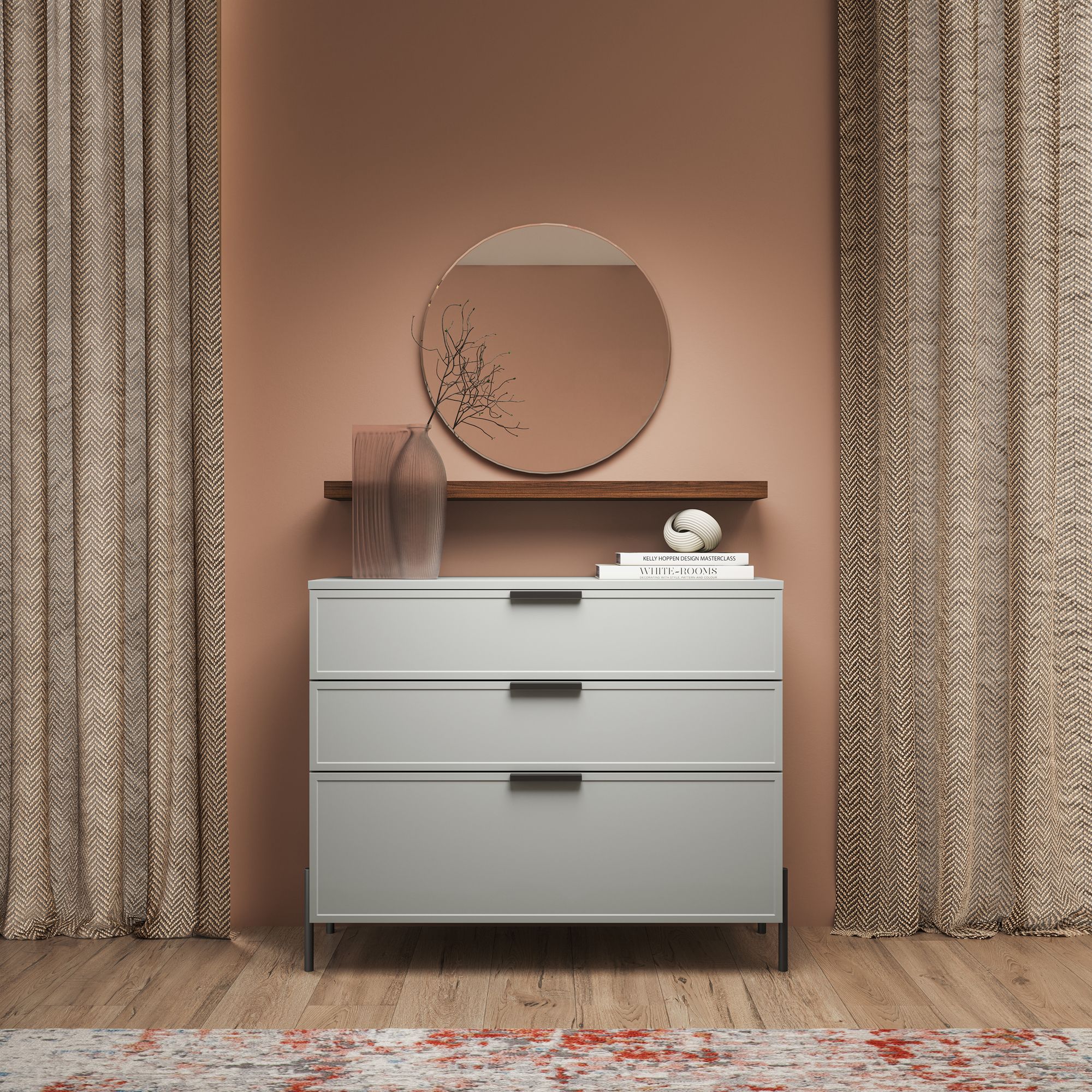 Полка NAPOLI, выполненная в отделке древесной текстурой, может использоваться как отдельно, так и в составе интерьерной композиции со шкафами и тумбами коллекции. Максимально допустимая распределенная нагрузка на изделие – 9 кг. Крепления входят в комплектацию.