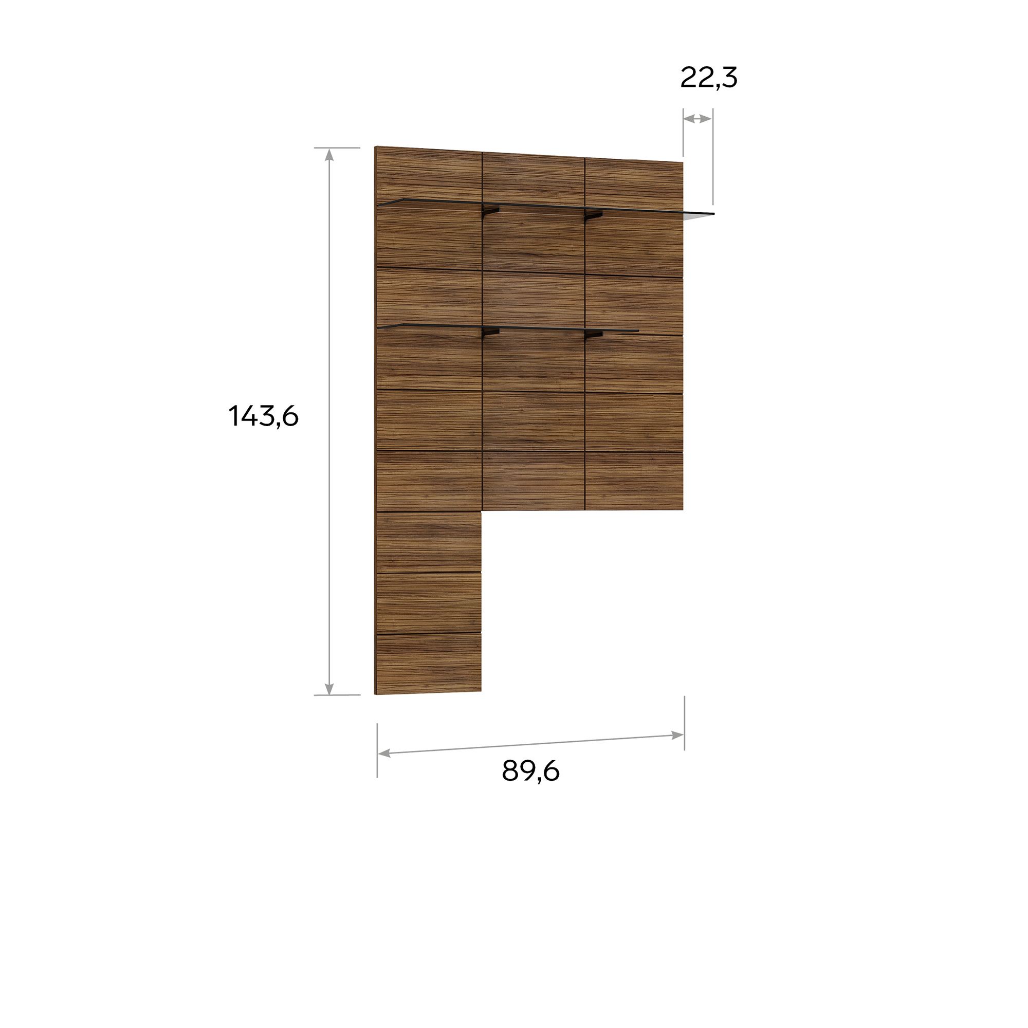 Декоративная панель MONAKO в отделке шпоном оснащается двумя полками из закаленного тонированного стекла (оттенок Бронза). Допустимая нагрузка на каждую полку – 3 кг. Панель используется в качестве приставного элемента в композиции с напольной ТВ-тумбой высотой 59,2 см. Крепления входят в комплектацию. Модель также предусматривает зеркальное исполнение.
