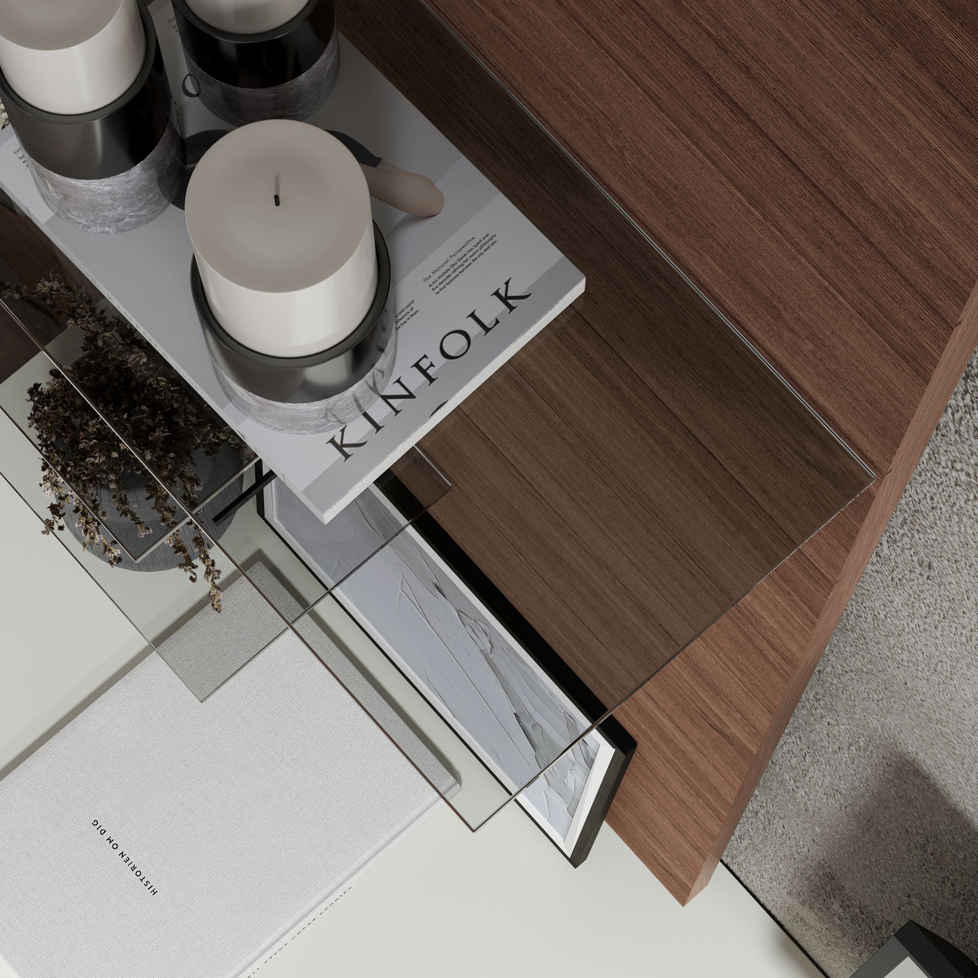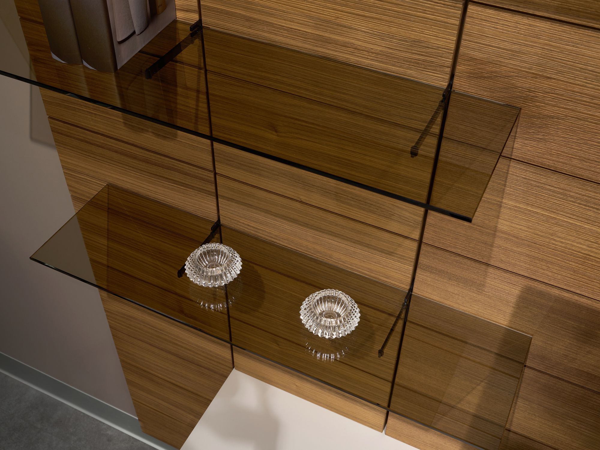 Коллекция предусматривает возможность использования декоративных настенных панелей в отделке натуральным шпоном, декорированным эксклюзивным тиснением. Панели оснащены стеклянными тонированными полками, которые отлично подходят для размещения декора.