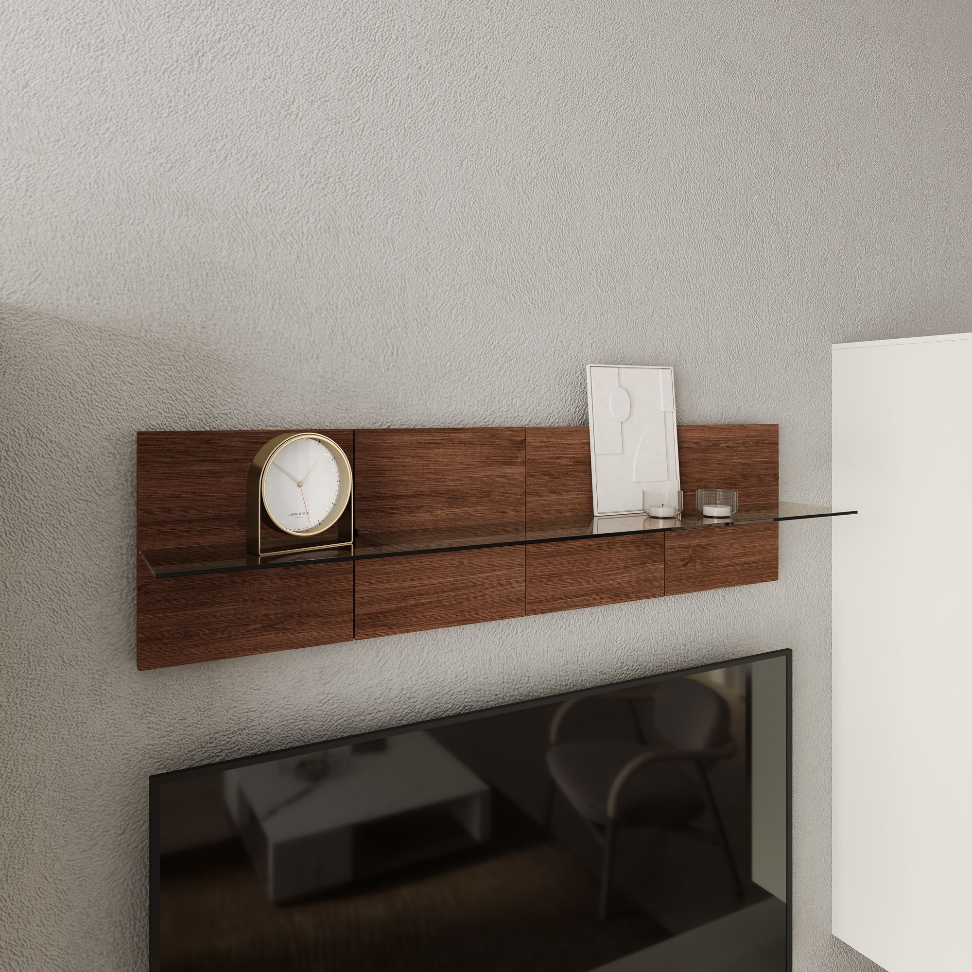 Коллекция предусматривает возможность использования декоративных настенных панелей в отделке натуральным шпоном, декорированным эксклюзивным тиснением. Панели оснащены стеклянными тонированными полками, которые отлично подходят для размещения декора.