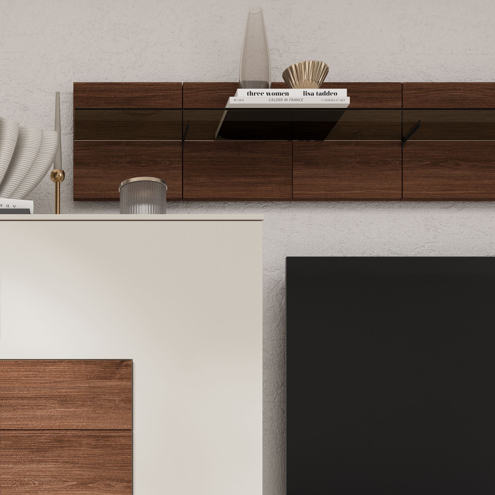 Коллекция предусматривает возможность использования декоративных настенных панелей в отделке натуральным шпоном, декорированным эксклюзивным тиснением. Панели оснащены стеклянными тонированными полками, которые отлично подходят для размещения декора.