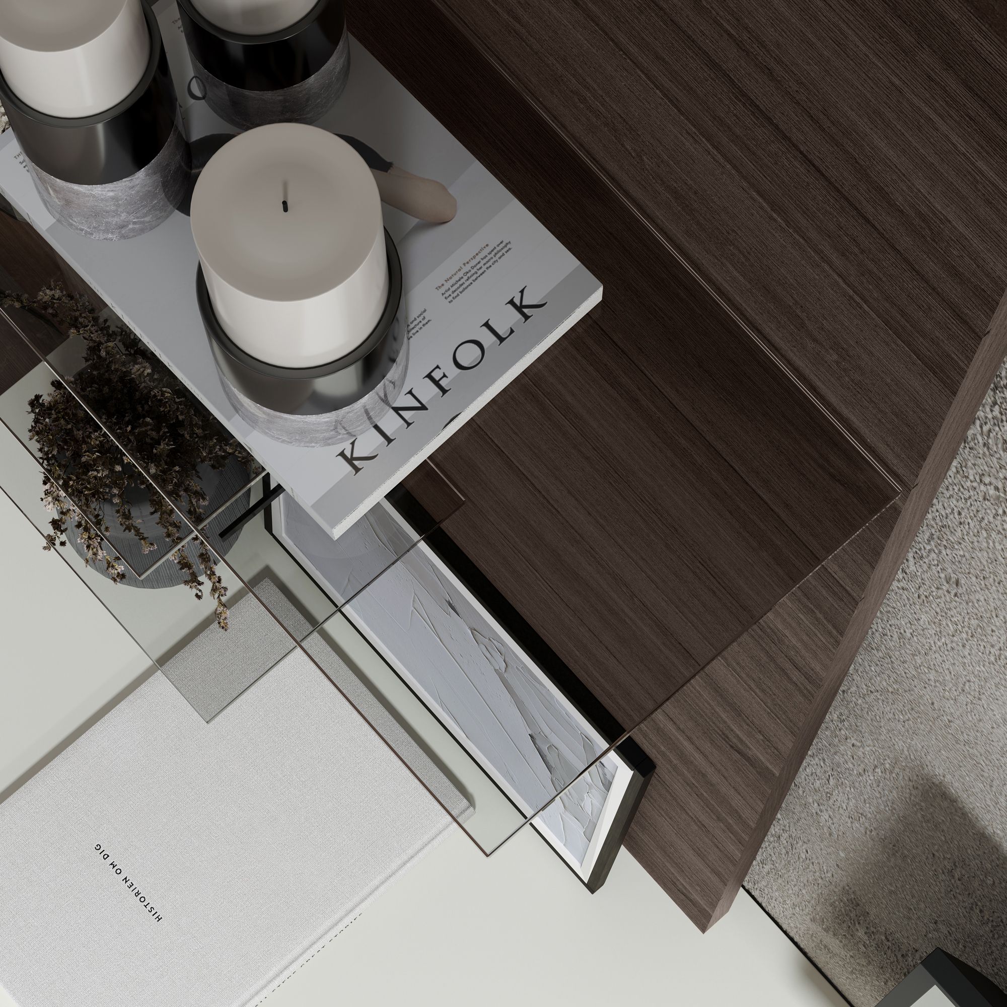 Декоративная панель MONAKO в отделке шпоном оснащается двумя полками из закаленного тонированного стекла (оттенок Бронза). Допустимая нагрузка на каждую полку – 3 кг. Панель используется в качестве приставного элемента в композиции с напольной ТВ-тумбой высотой 59,2 см. Модель также предусматривает зеркальное исполнение.