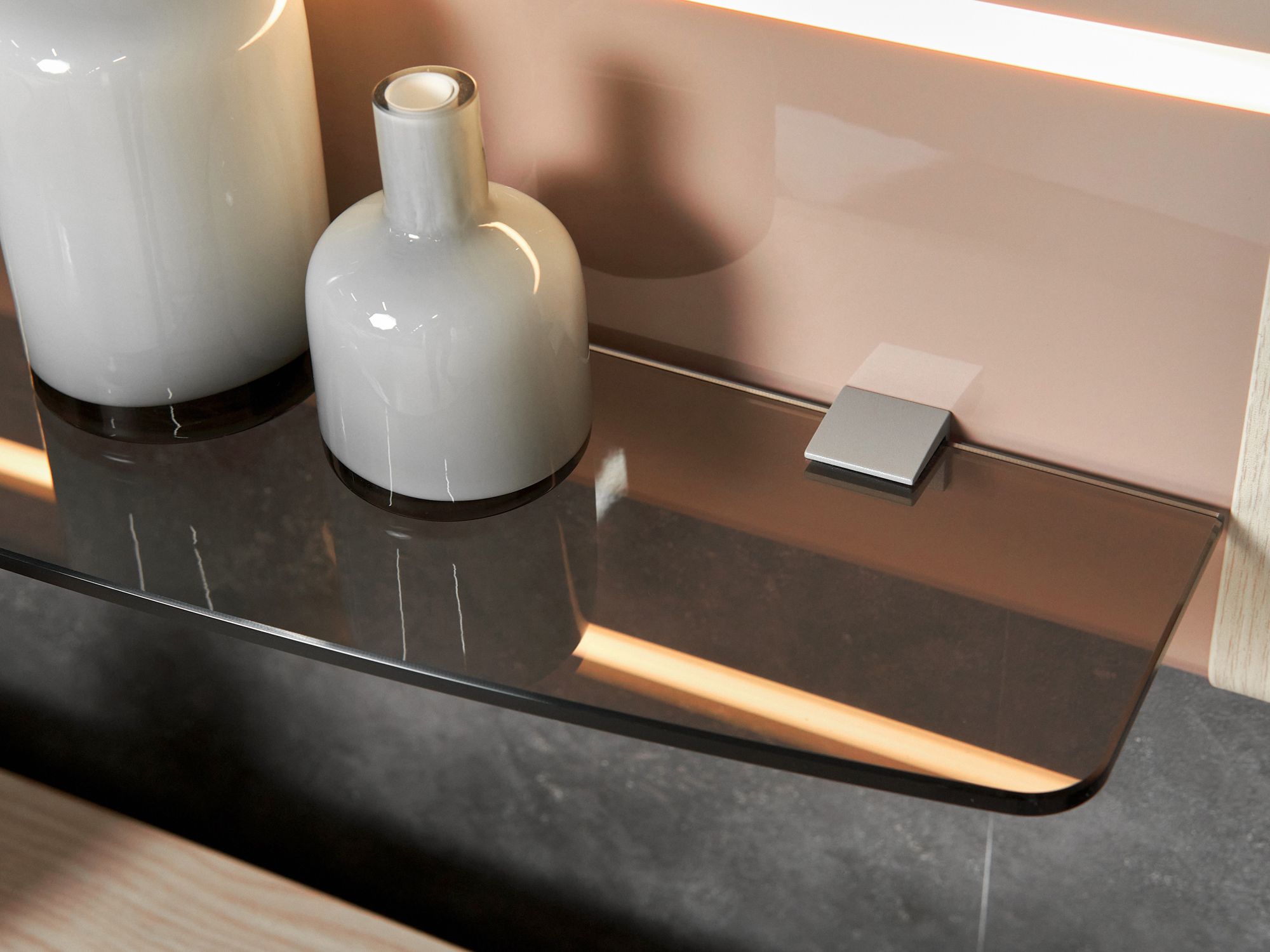 Полки ESTE повторяют дизайн кровати и могут крепиться вплотную к ней, создавая эффект монолитного изголовья. Их глянцевые вставки оснащены дизайнерской подсветкой «световая полоса», которая идеально подходит для вечернего сценария освещения. Система оснащена сенсорным угловым выключателем (включение при касании кнопки). Полка выполнена из безопасного закаленного тонированного стекла, обладающего повышенной механической прочностью. Максимальная допустимая нагрузка – 3 кг. Крепления входят в комплектацию.