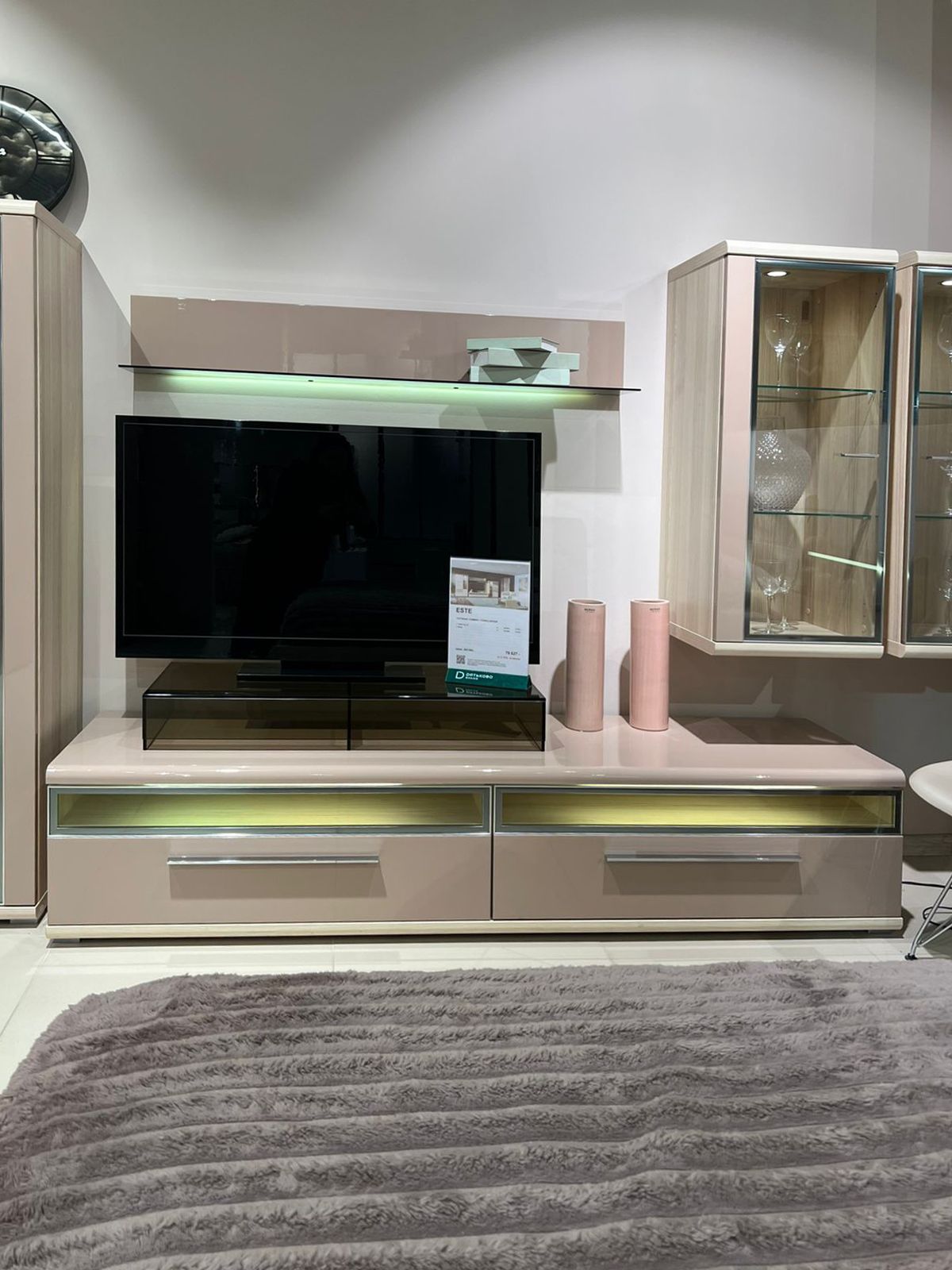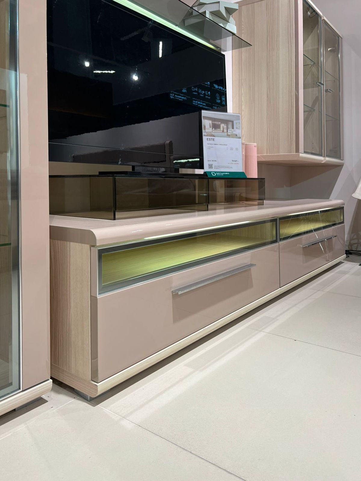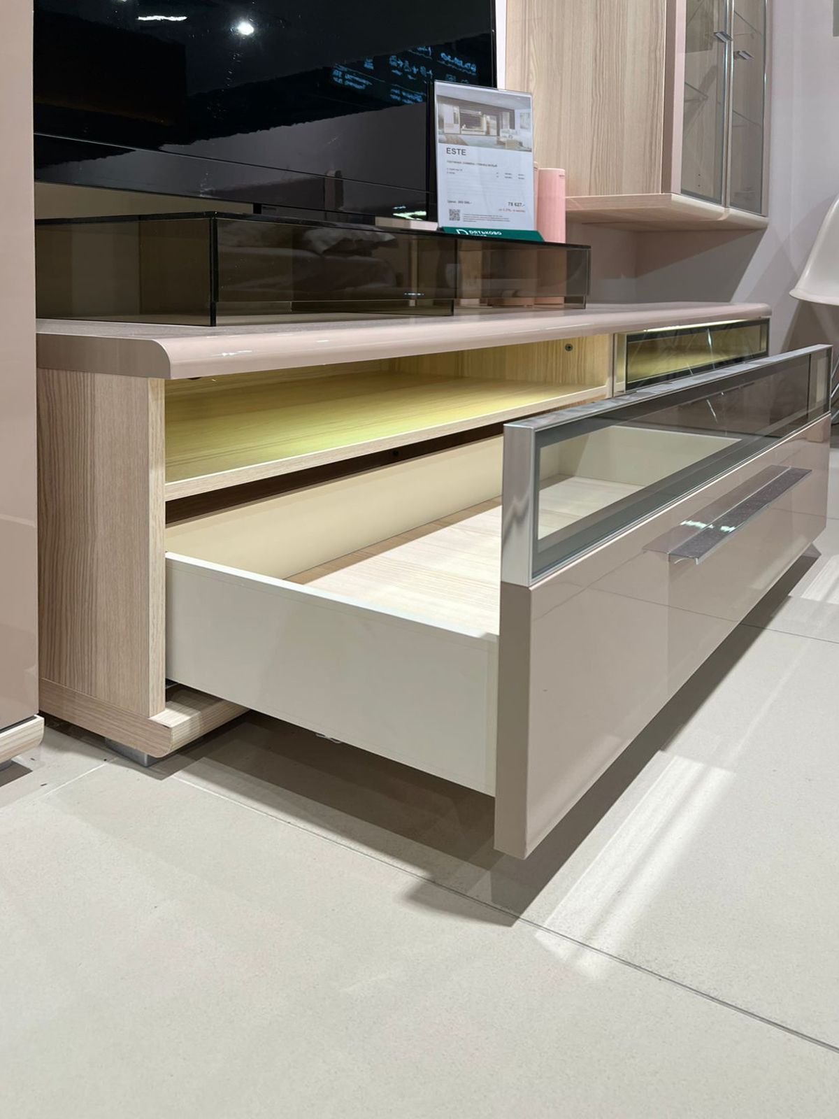 Тумба под ТВ в текстуре Coimbra / Глянец Mokko. Благодаря качественным направляющим европейского производства ящики открываются и закрываются плавно и бесшумно.