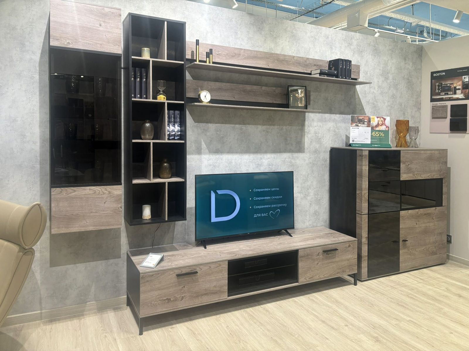 Готовая мебельная композиция для гостиной в текстуре Дуб Grande / Galaxy. В состав предлагаемой композиции входит:
