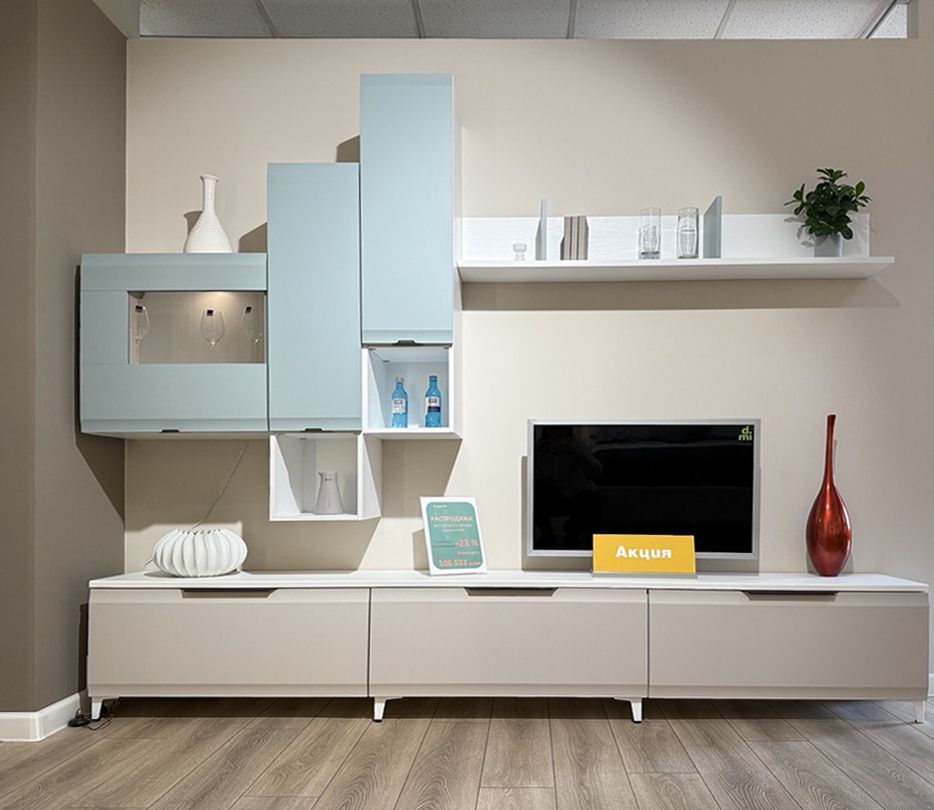 Состав композиции: тумба под ТВ в текстуре Белый / Cashmere, подвесные шкафы в текстуре Белый / Laguna, полка в текстуре Белый / Laguna, подсветка.