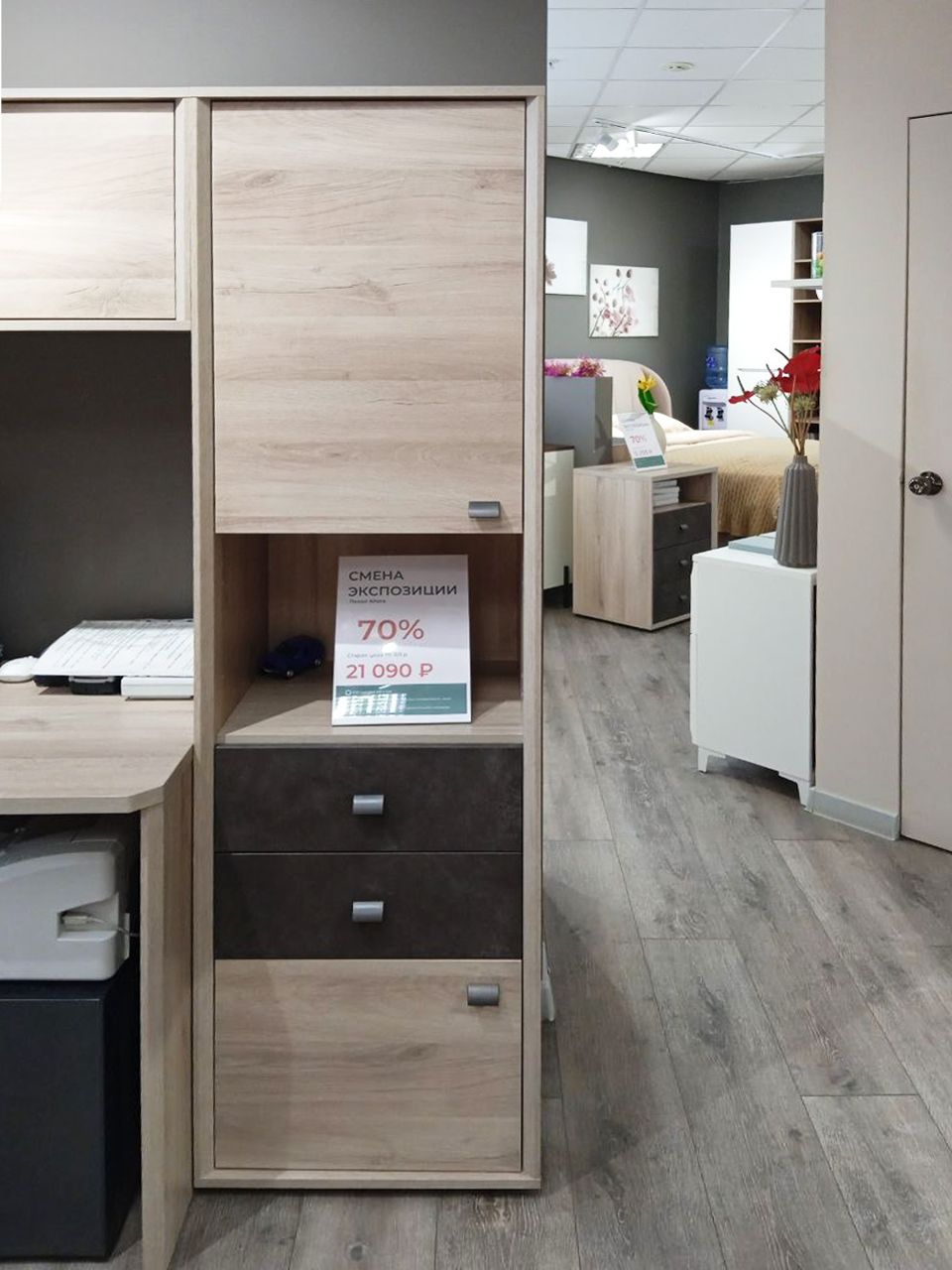 Шкаф-пенал с выдвижными ящиками и левым открыванием дверей в текстуре Дуб Anziano / Roxy. В дизайне шкафа использована система «вложенный фасад».