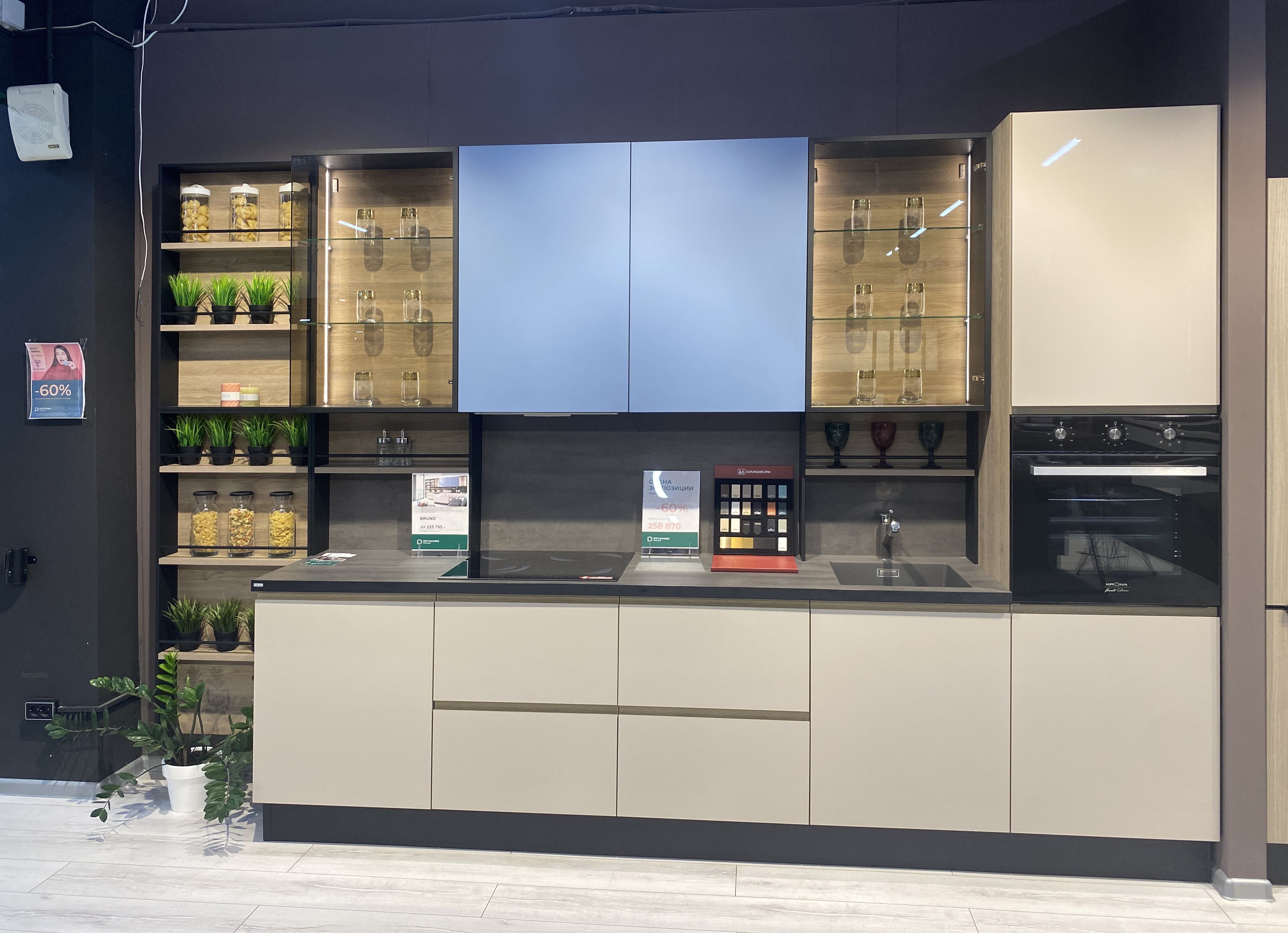 Кухня в текстуре Дуб Гладстоун серо-бежевый / Кашемир / синий. Корпус Оникс серый. Длина кухни 360 см. Высота кухни 243 см.