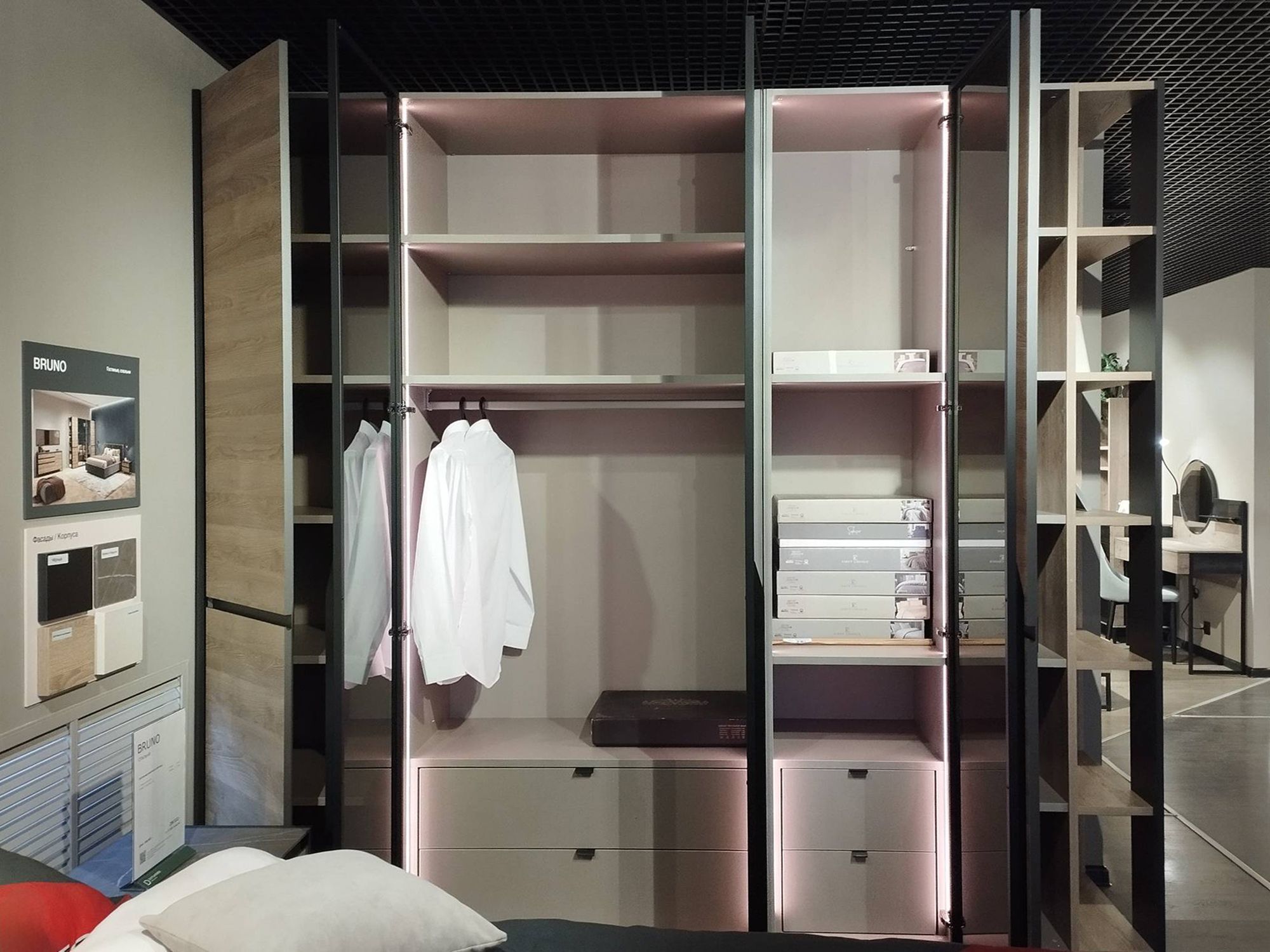 – Однодверный шкаф со штангой, полками и стеклянным фасадом (правое открывание);