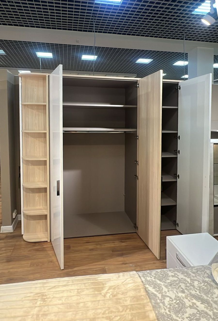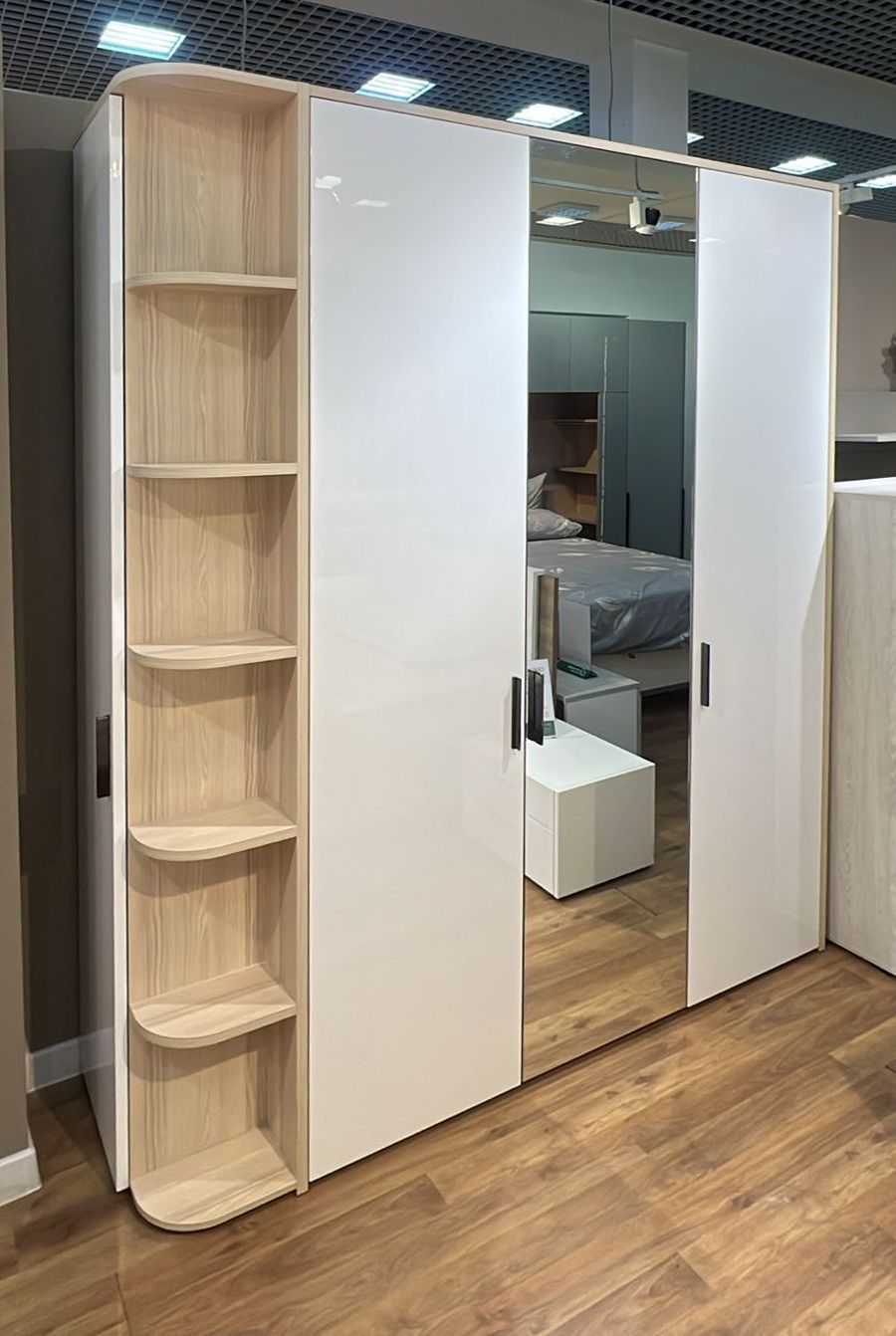 Четырехдверный шкаф с завершающим стеллажом в текстуре Coimbra / Глянец белый.