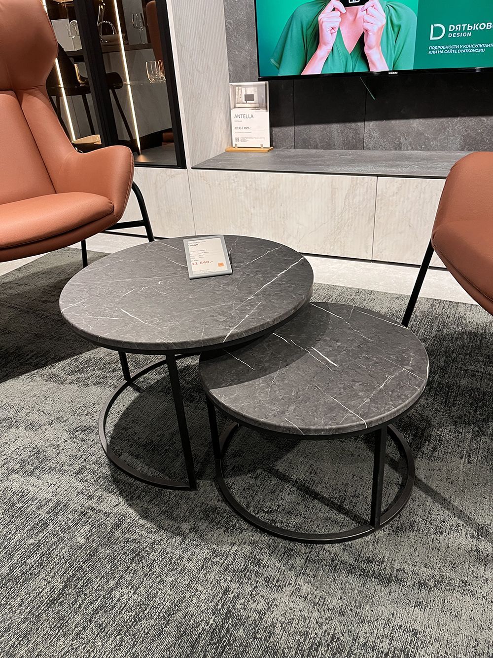 Набор кофейных столиков Tango в текстуре серый мрамор с чёрными ножками.