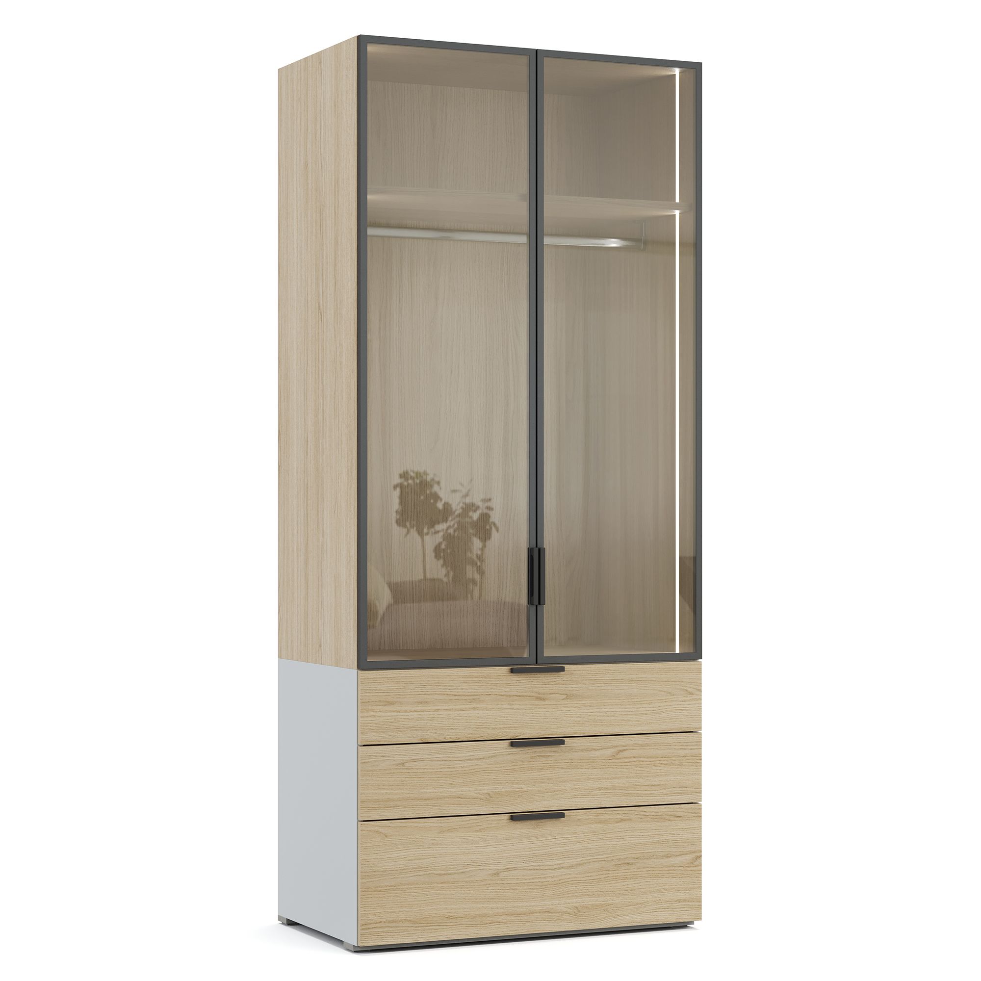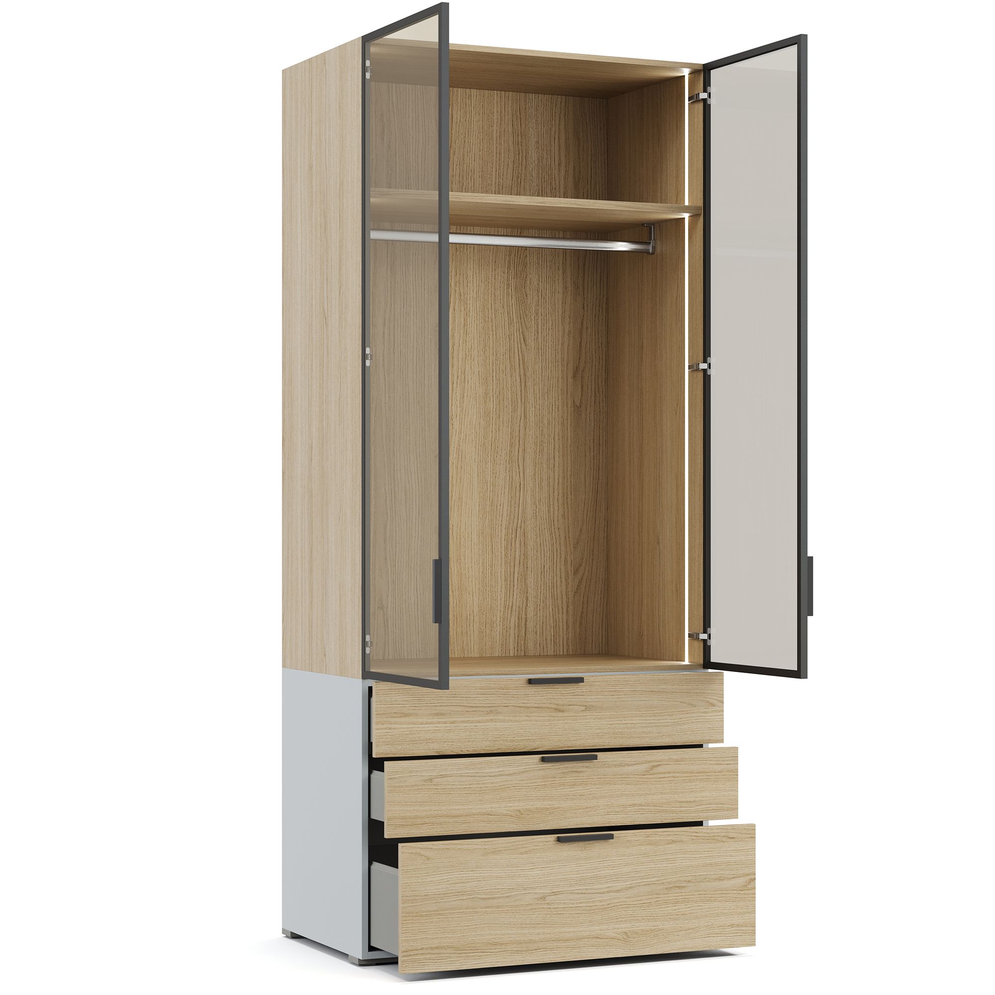 Верхняя часть двухдверного шкафа NAPOLI оснащена распашными фасадами из тонированного стекла с зеркальным эффектом. Внутреннее наполнение представляет собой полку из ЛДСП, к которой крепится штанга для вешалок. Шкаф оборудован внутренней подсветкой (система включения заказывается отдельно). В нижней части расположены три выдвижных ящика с фасадами в отделке древесной текстурой. Внутренний декор ящиков выполнен в текстуре Шенилл.