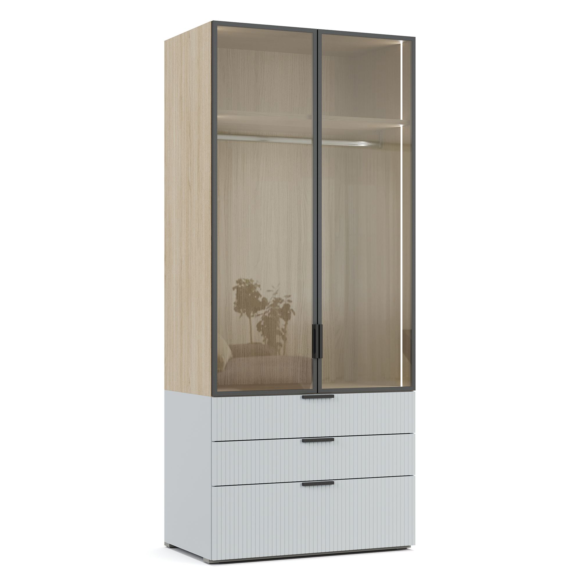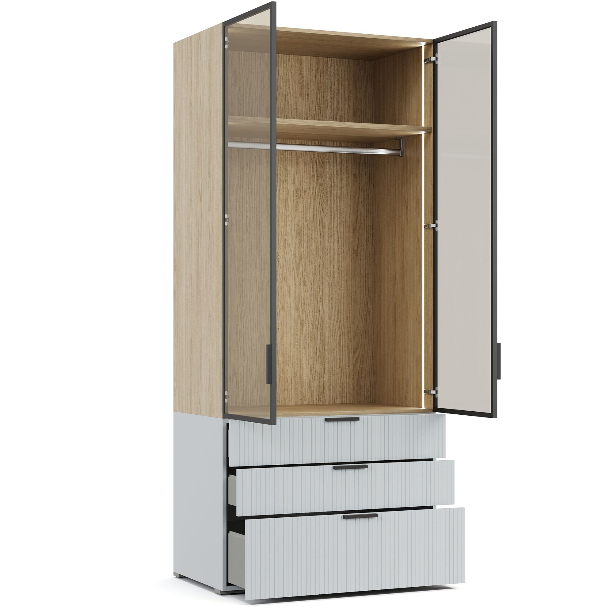 Верхняя часть двухдверного шкафа NAPOLI оснащена распашными фасадами из тонированного стекла с зеркальным эффектом. Внутреннее наполнение представляет собой полку из ЛДСП, к которой крепится штанга для вешалок. Шкаф оборудован внутренней подсветкой (система включения заказывается отдельно). В нижней части расположены три выдвижных ящика с фасадами в отделке вертикальной фрезеровкой. Внутренний декор ящиков выполнен в текстуре Шенилл.