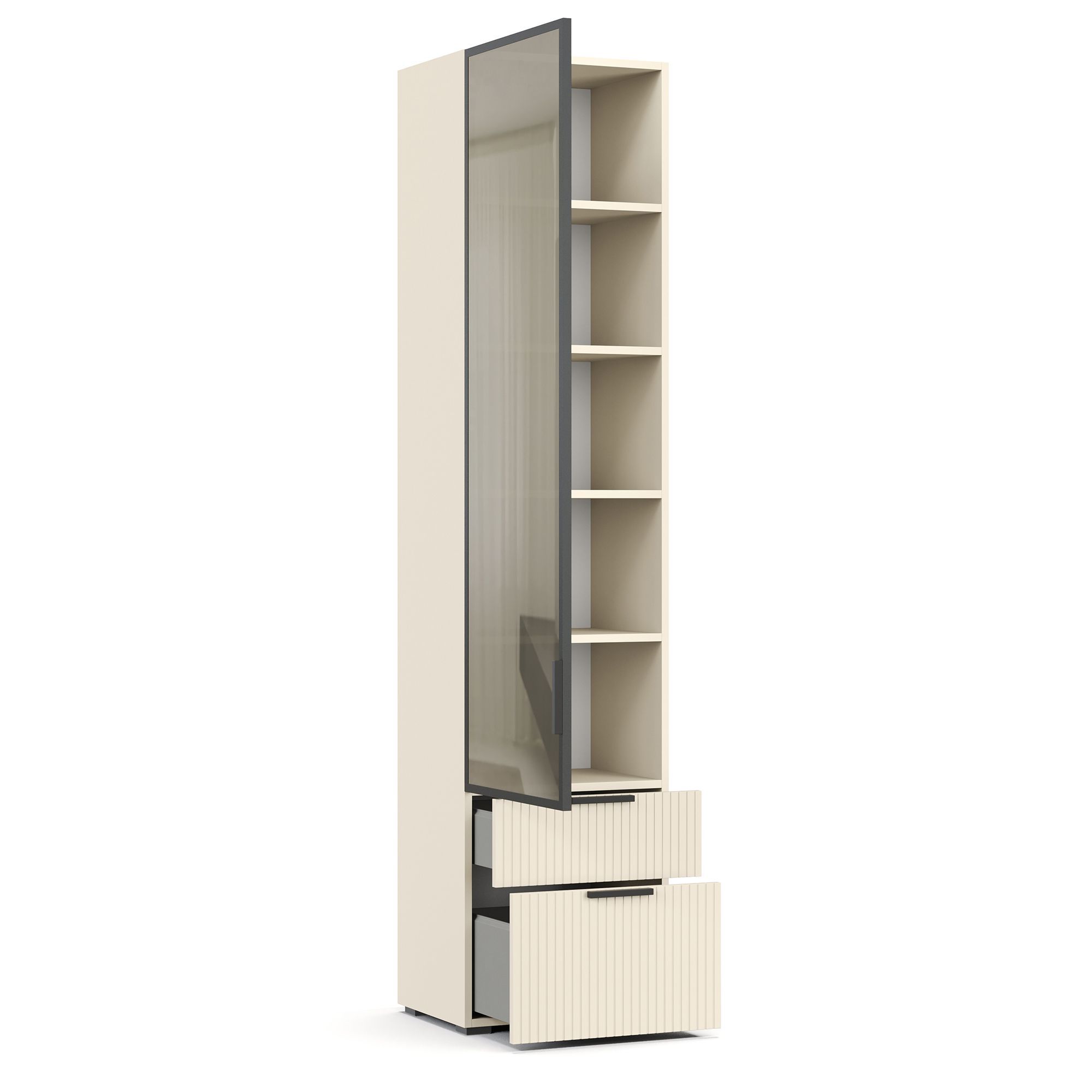 Верхняя часть шкафа-витрины NAPOLI оснащена фасадом с тонированным стеклом, обладающим зеркальным эффектом, за которым располагаются полки из ЛДСП. Цвет задней стенки – белый. Предусмотрены варианты с левым и правым открыванием фасада. В нижней части расположены два выдвижных ящика, декорированных вертикальной фрезеровкой. В качестве опции предлагается установка шкафа на опоры высотой 12 см (заказываются отдельно).