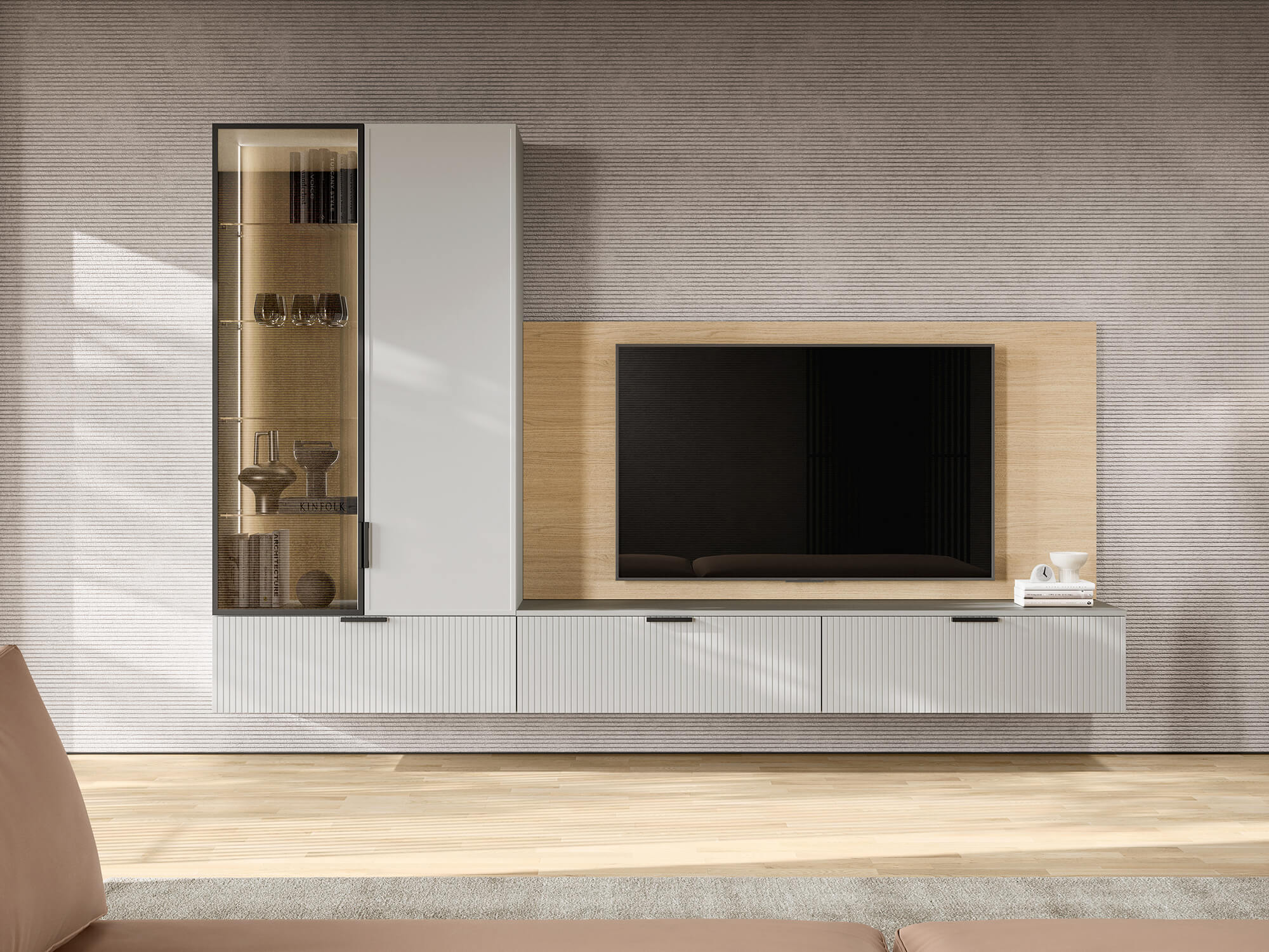 В отделке фасадов коллекции используется пластик высокой плотности нового поколения (Италия). Суперматовая поверхность выглядит роскошно, а на ощупь приятная и тёплая, как шёлк. Специальная обработка обеспечивает защиту фасадов от царапин (мелкие потертости на покрытии сами исчезают при нагреве), а технология ANTI FINGERPRINT гарантирует отсутствие отпечатков пальцев. Универсальный базовый оттенок Серый перламутровый удачно сочетается с древесными декорами с содержанием теплого спектра.