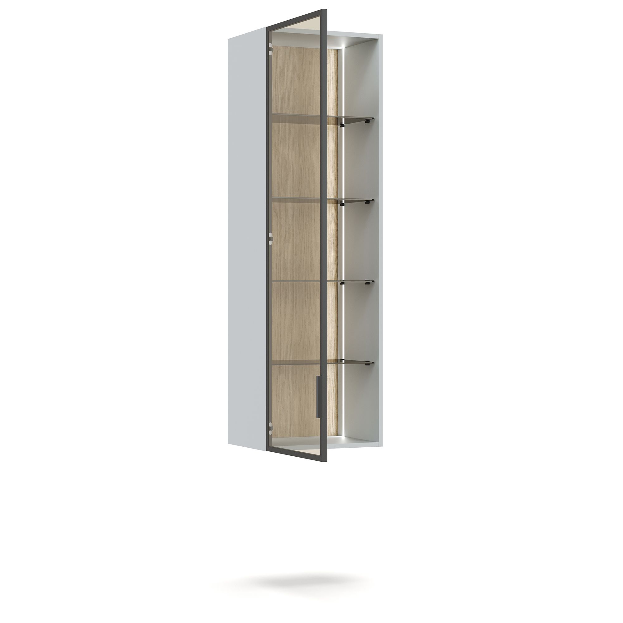 Навесной шкаф NAPOLI оснащен фасадом из тонированного стекла с зеркальным эффектом, за которым располагается система стеклянных полок, а также двумя врезными светильниками (система выключения заказывается отдельно). Предусмотрены варианты с левым и правым открыванием фасада. Помимо навешивания на стену, предусмотрена установка шкафа на тумбу. Максимально допустимая распределенная нагрузка на изделие – 20 кг.