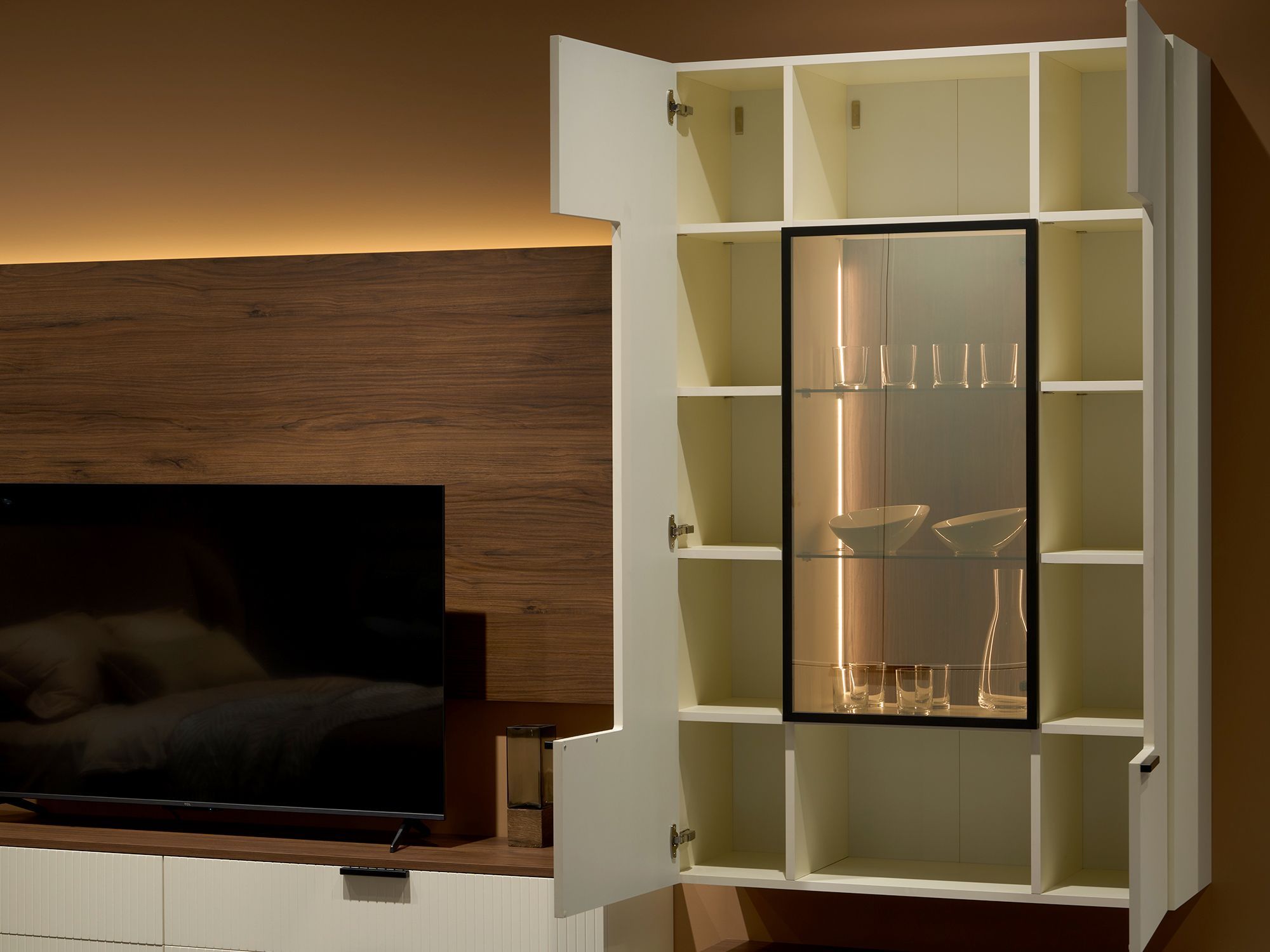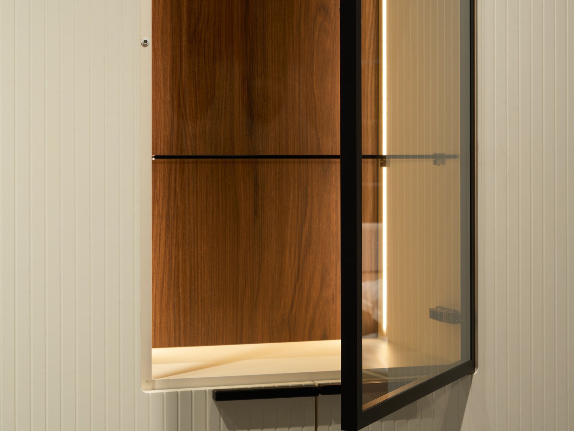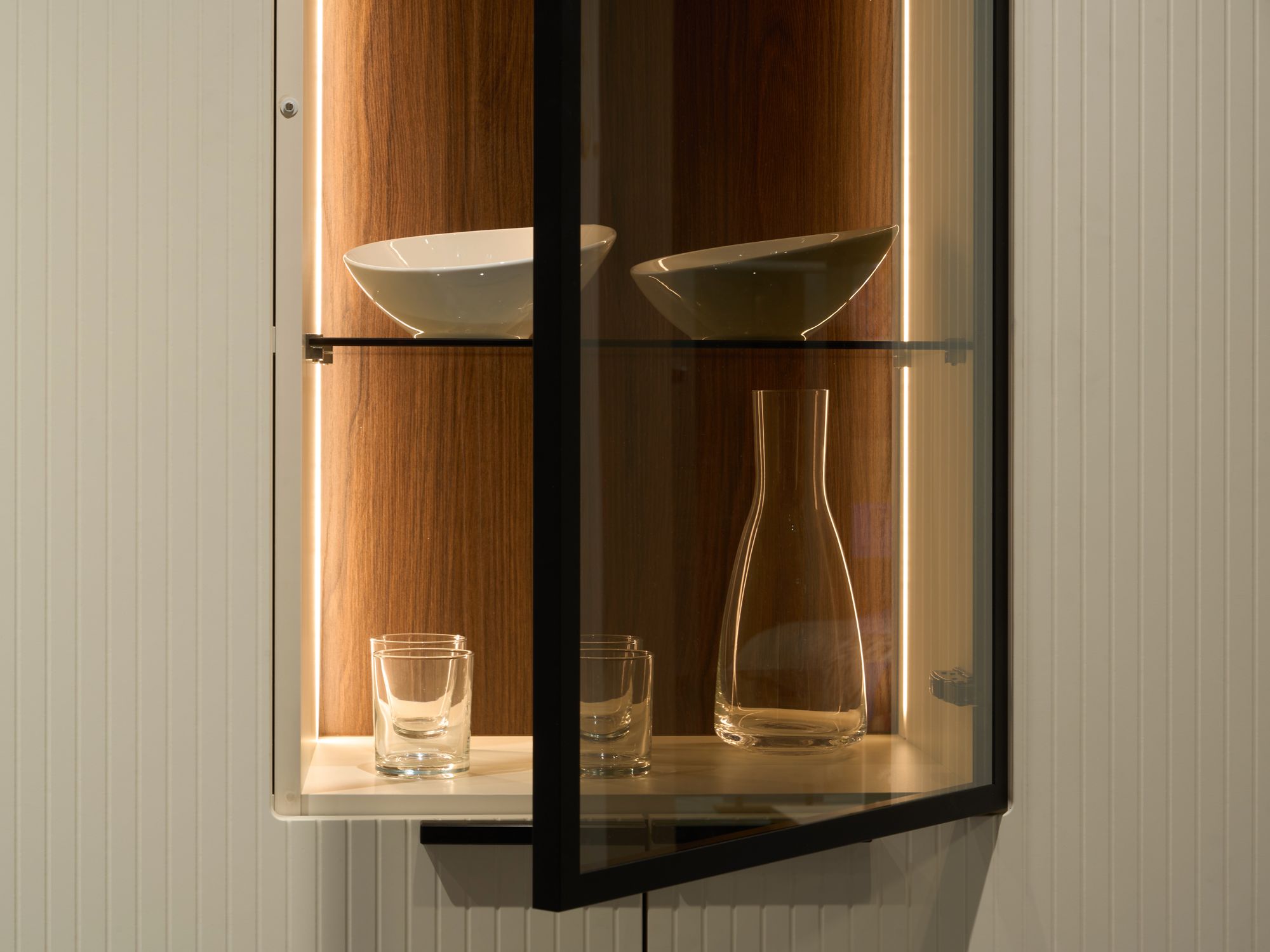 Навесной шкаф имеет необычную конструкцию «корпус в корпусе», которая требует высокой точности исполнения, и потому не имеет аналогов на российском рынке. Благодаря оригинальному дизайну шкаф служит центральным элементом интерьера, создавая выразительный акцент. Для открывания фасада со стеклом используется система Push-to-open.