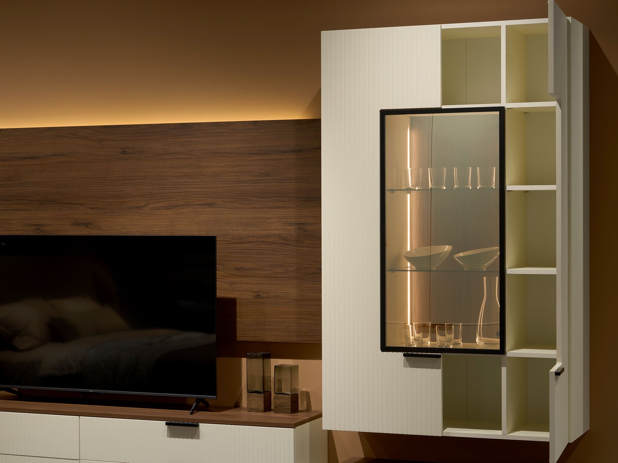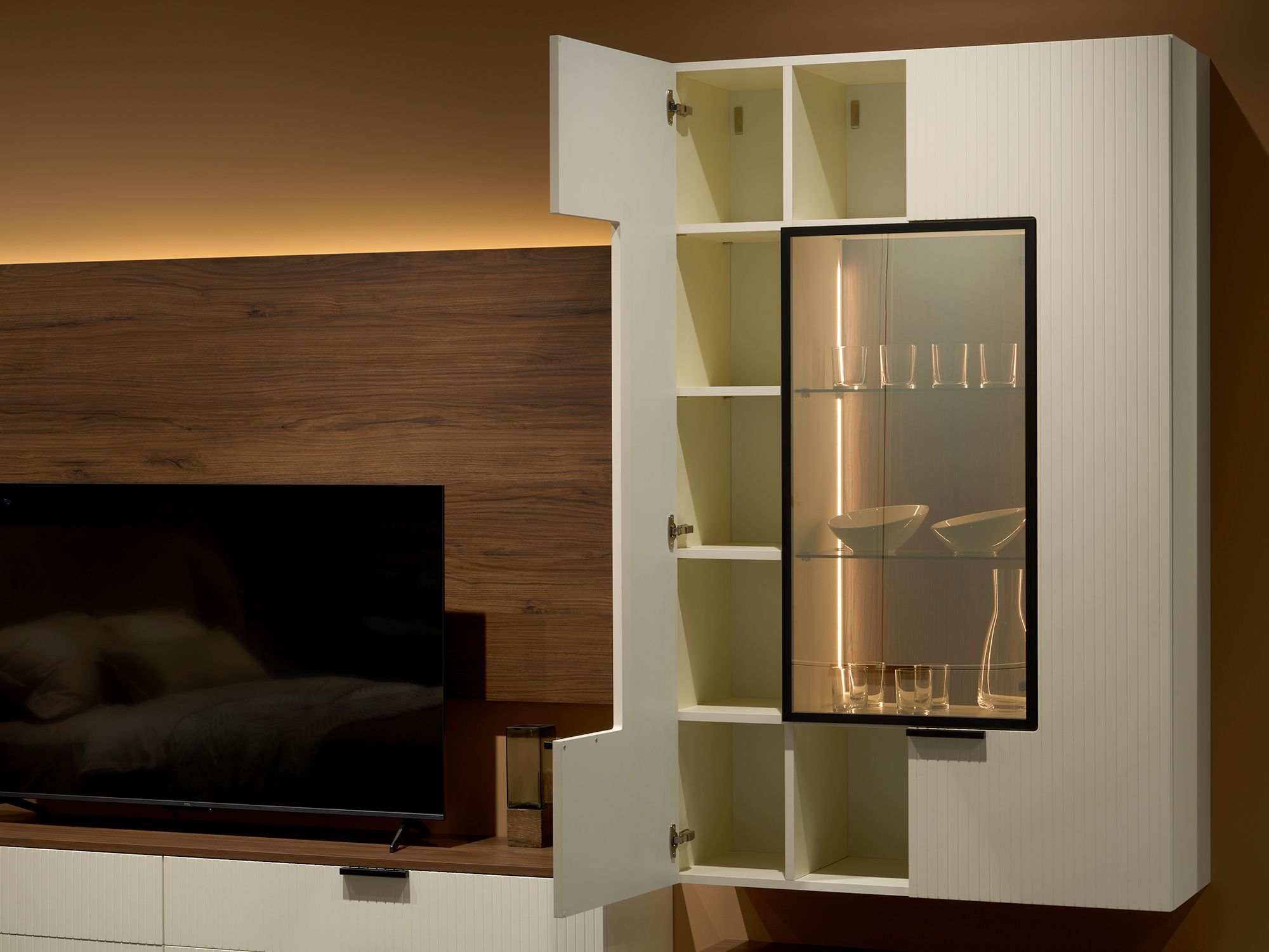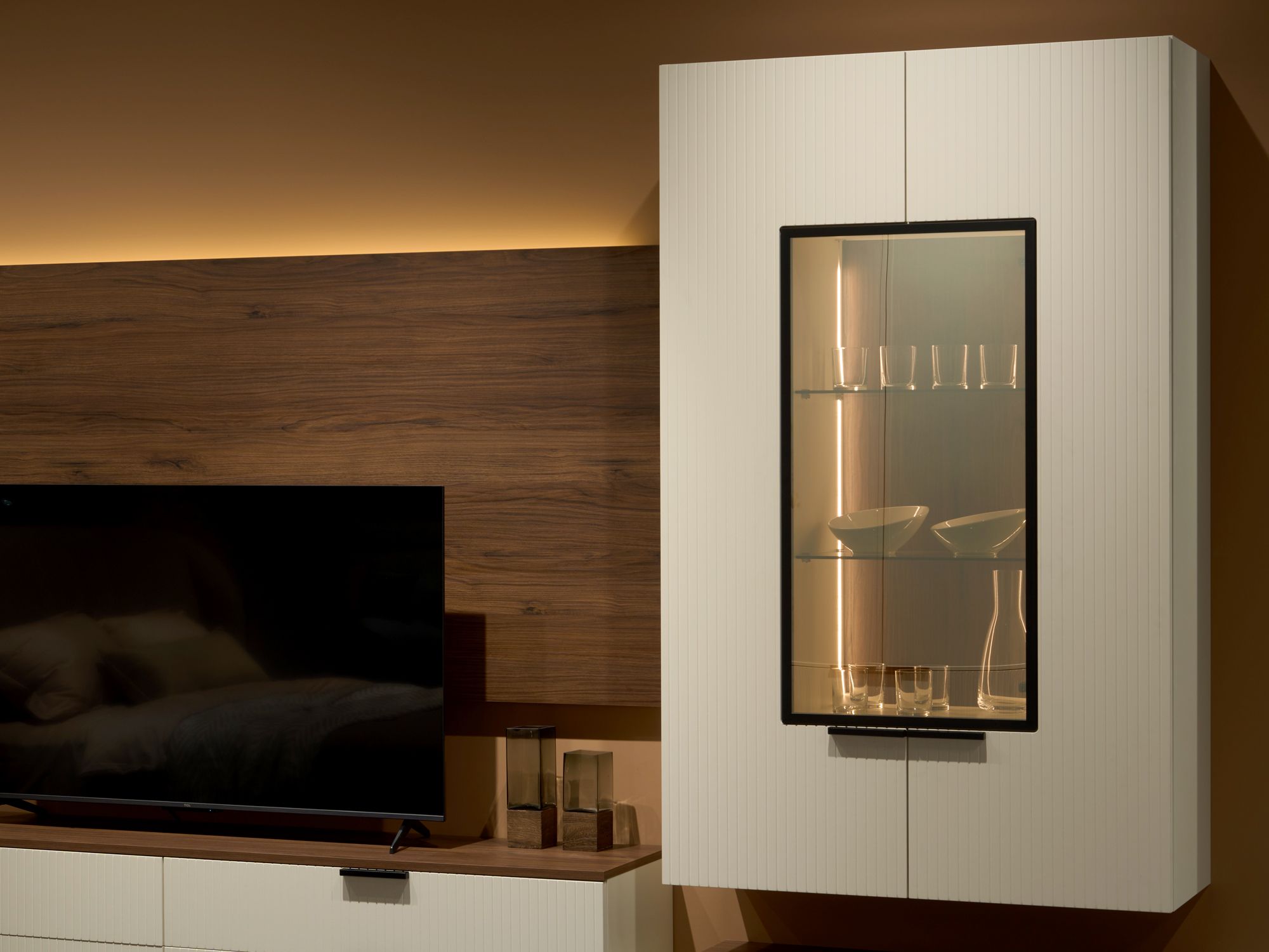 Навесной шкаф имеет необычную конструкцию «корпус в корпусе», которая требует высокой точности исполнения, и потому не имеет аналогов на российском рынке. Благодаря оригинальному дизайну шкаф служит центральным элементом интерьера, создавая выразительный акцент. Для открывания фасада со стеклом используется система Push-to-open.