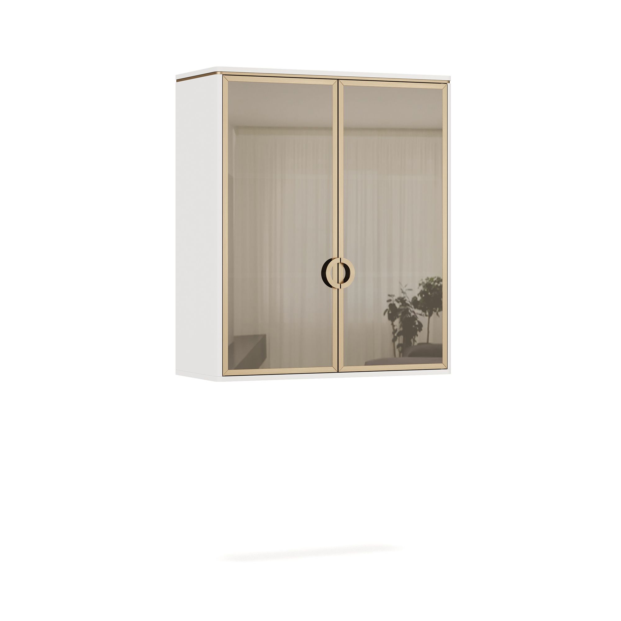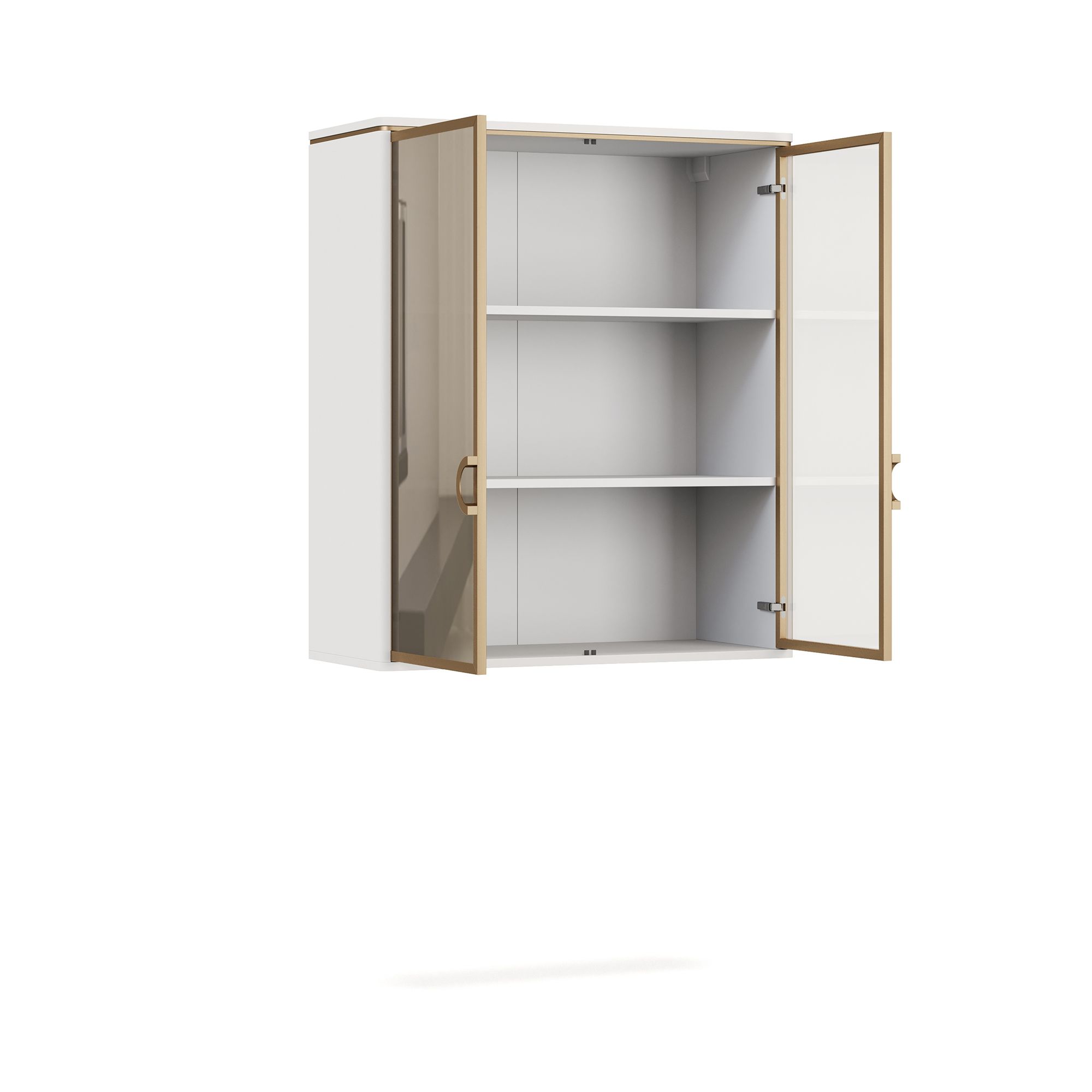 Распашные фасады двухдверного навесного шкафа TIARA выполнены из тонированного стекла бронзового оттенка с зеркальным эффектом. За стеклами, заключенными в металлическую раму с покрытием Матовое золото, расположена система полок из ЛДСП. Максимально допустимая распределенная нагрузка – 20 кг.