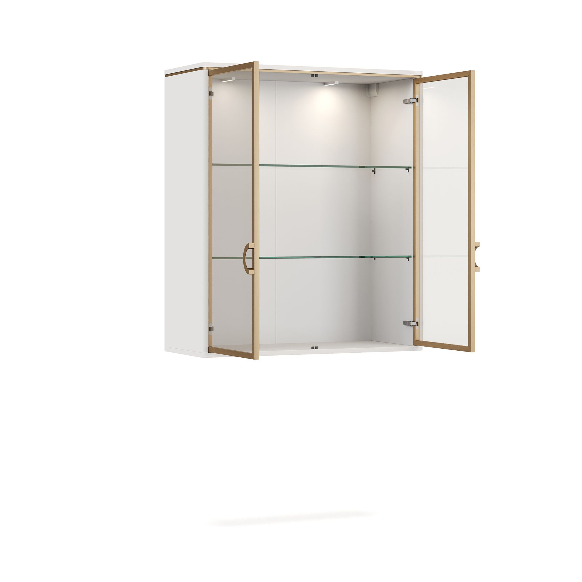 Распашные фасады двухдверного навесного шкафа TIARA выполнены из тонированного стекла бронзового оттенка с зеркальным эффектом. За стеклами, заключенными в металлическую раму с покрытием Матовое золото, расположена система стеклянных полок. Максимально допустимая распределенная нагрузка – 20 кг.
