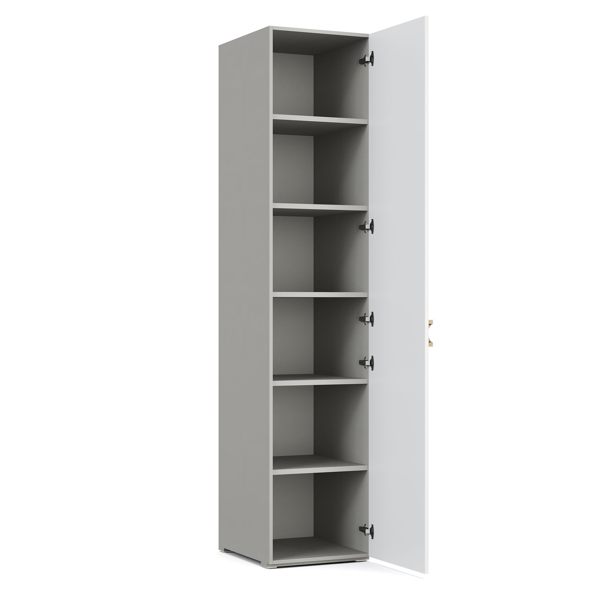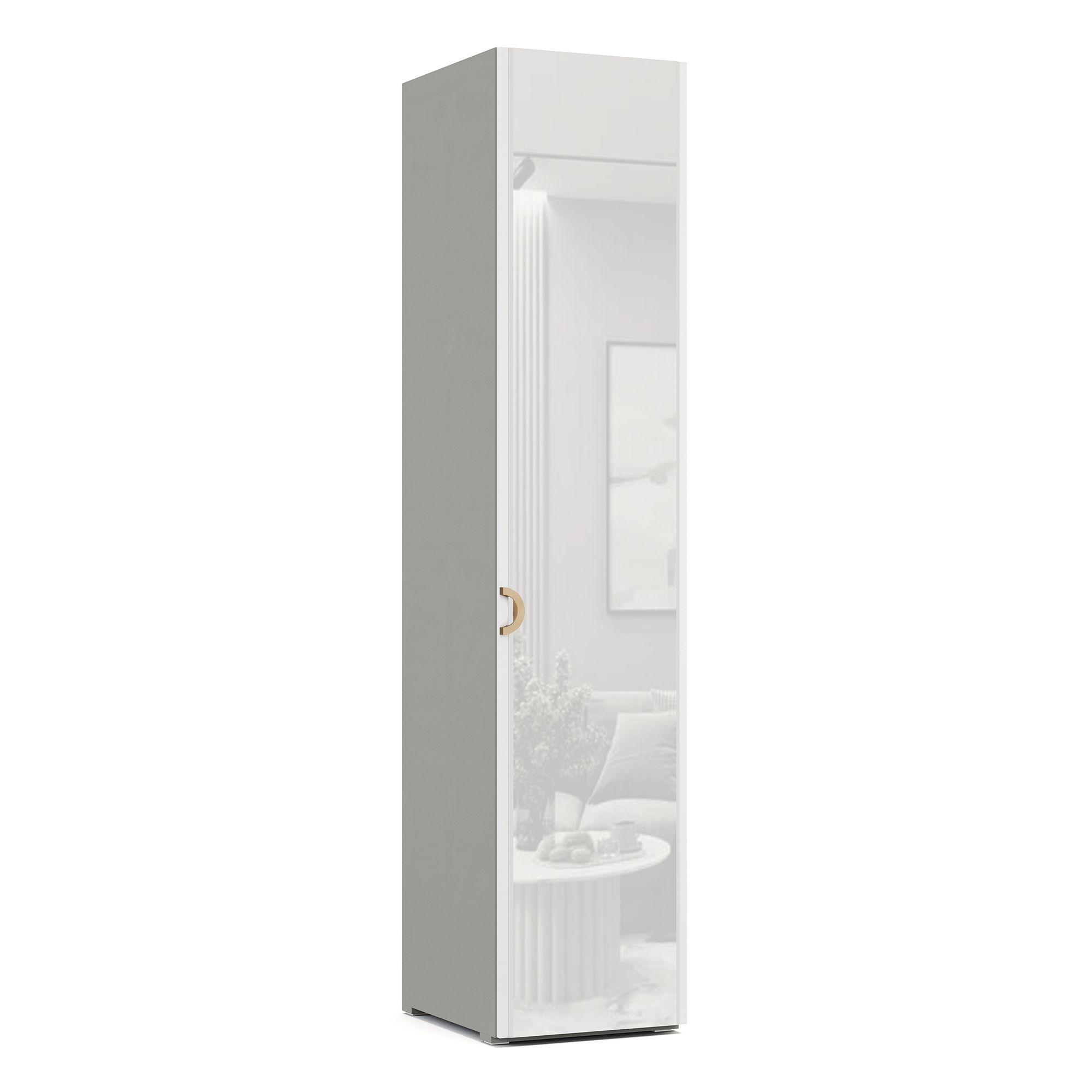 Внутреннее пространство однодверного платяного шкафа TIARA представляет собой систему полок. Внешний и внутренний декор корпуса выполнен в текстуре Шенилл, повторяющей рисунок натуральной ткани. Фасад модели имеет зеркальное исполнение и оснащен ручкой в отделке Матовое золото. Возможно как правое, так и левое открывание.