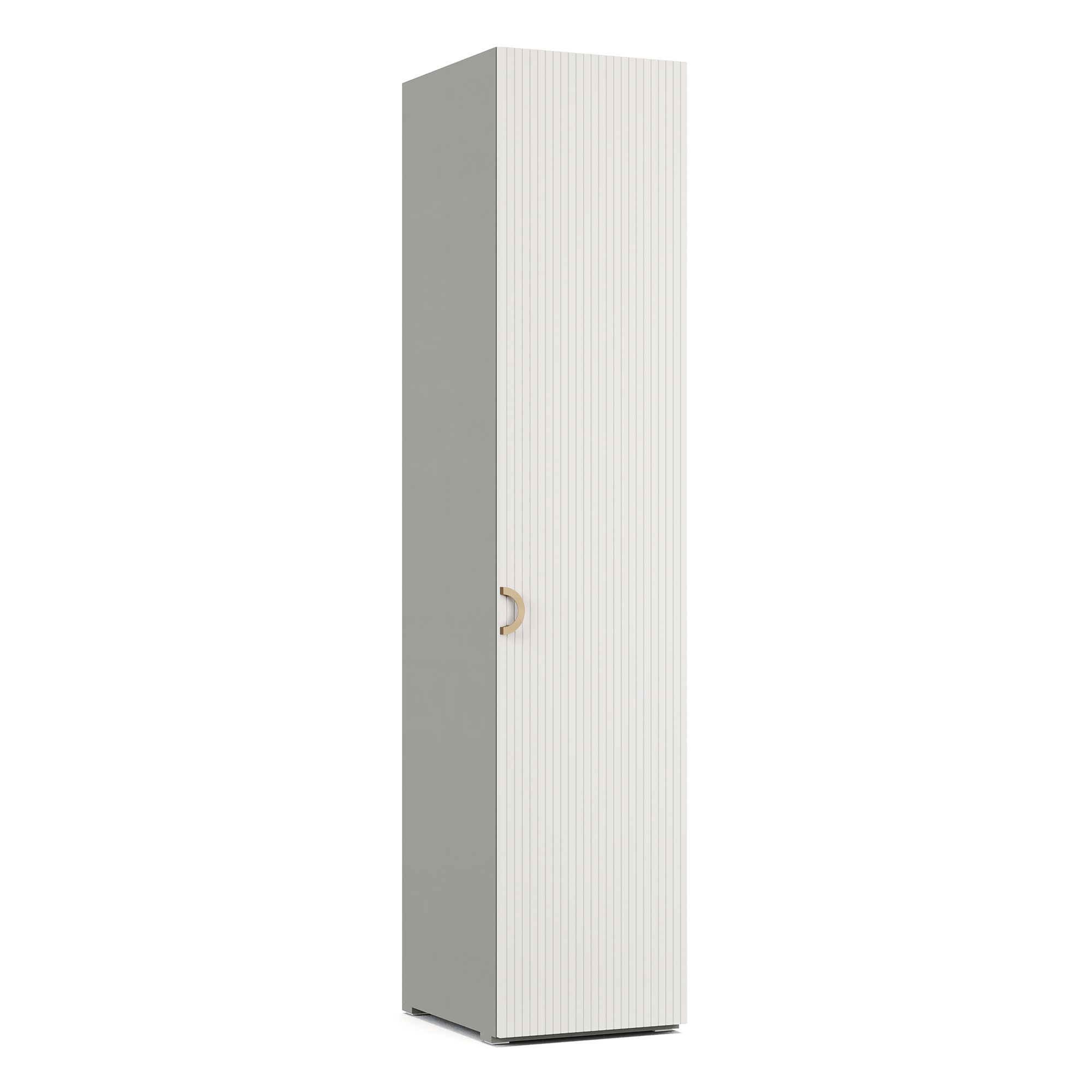 В верхней части однодверного платяного шкафа TIARA расположены две полки, к нижней из которых крепится штанга для вешалок. Внешний и внутренний декор корпуса выполнен в текстуре Шенилл, повторяющей рисунок натуральной ткани. Фасад модели выполнен в отделке эмалью, декорирован вертикальной фрезеровкой и оснащен ручкой в отделке Матовое золото. Возможно как правое, так и левое открывание.