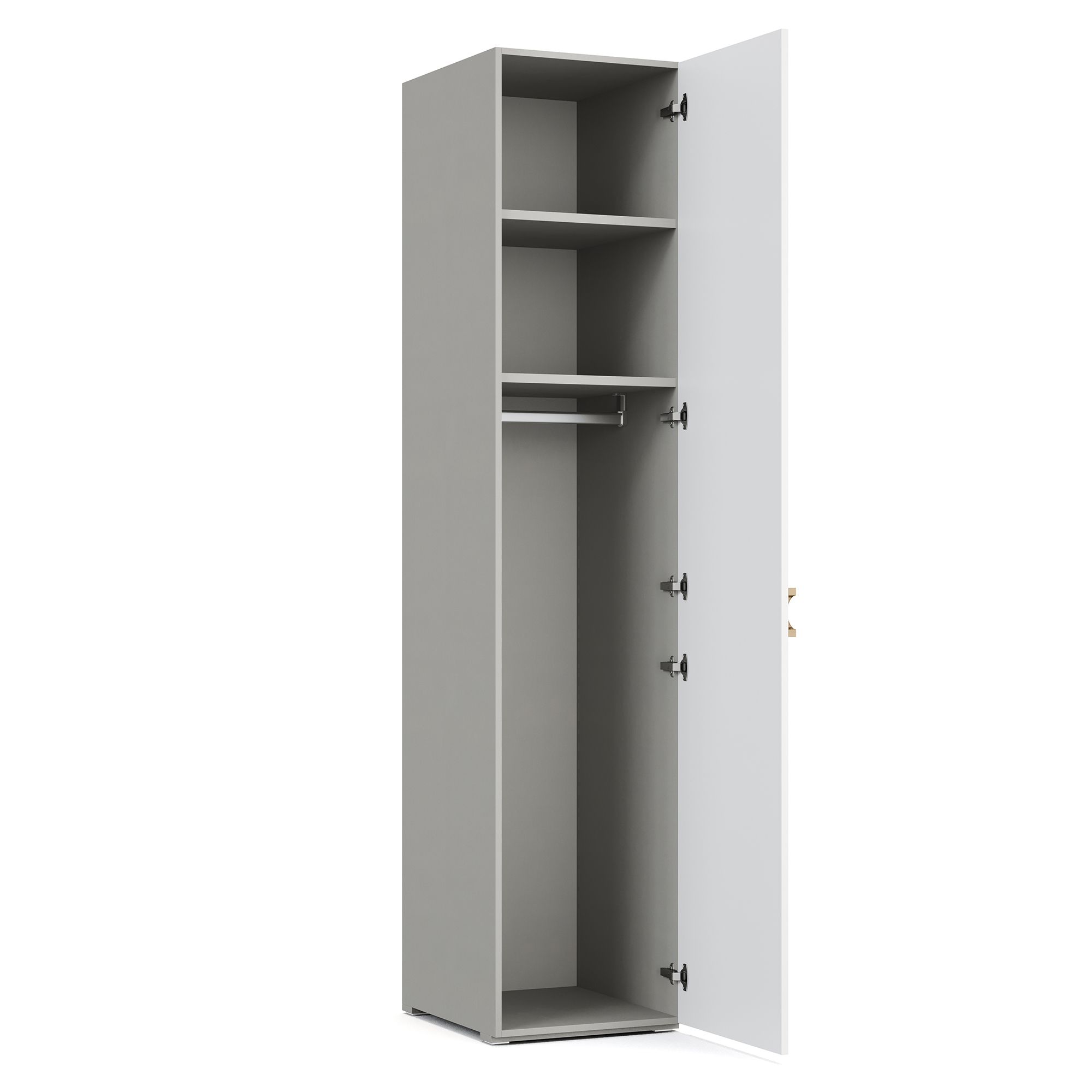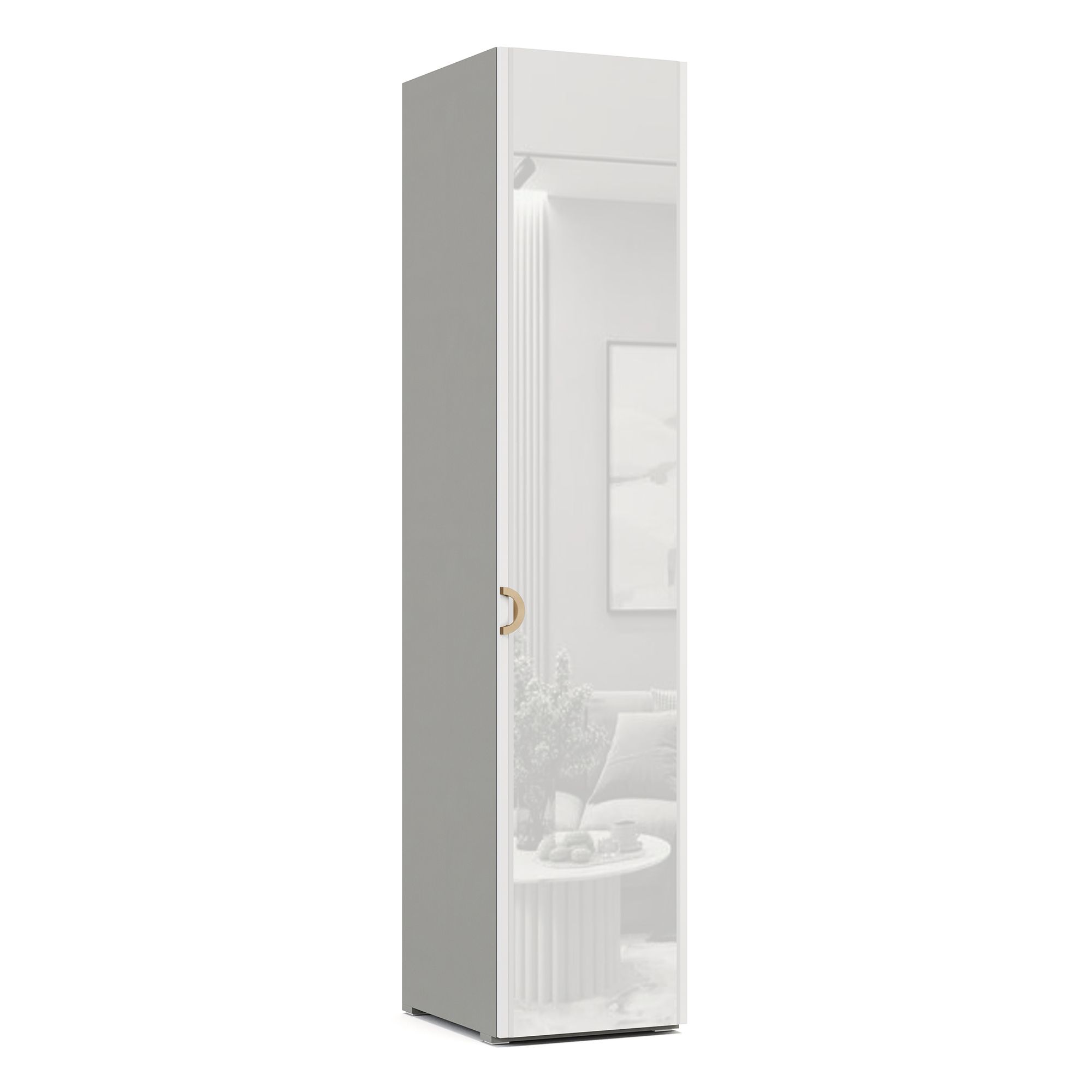 В верхней части однодверного платяного шкафа TIARA расположены две полки, к нижней из которых крепится штанга для вешалок. Внешний и внутренний декор корпуса выполнен в текстуре Шенилл, повторяющей рисунок натуральной ткани. Фасад модели имеет зеркальное исполнение и оснащен ручкой в отделке Матовое золото. Возможно как правое, так и левое открывание.