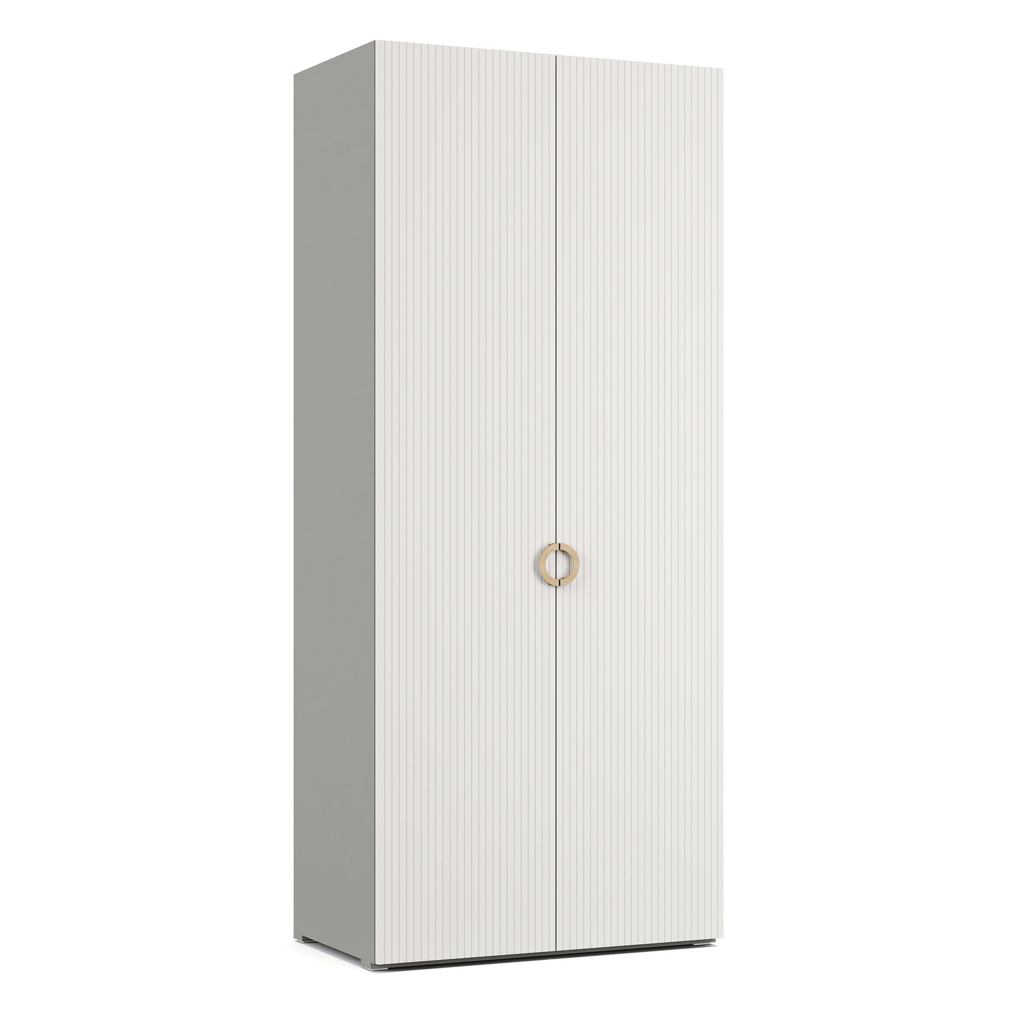 В верхней части двухдверного платяного шкафа TIARA расположены две полки, к нижней из которых крепится штанга для вешалок. Внешний и внутренний декор корпуса выполнен в текстуре Шенилл, повторяющей рисунок натуральной ткани. Фасады модели выполнены в отделке эмалью, декорированы вертикальной фрезеровкой и оснащены ручками в отделке Матовое золото.