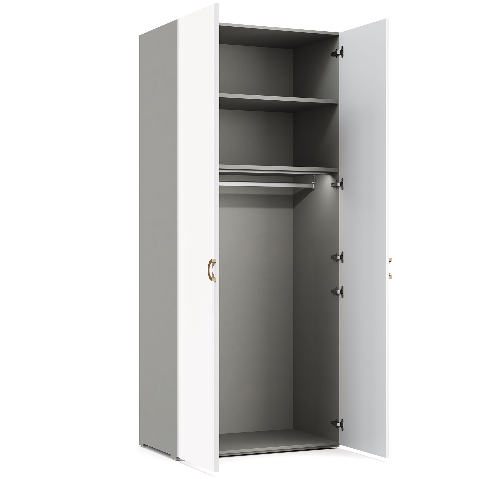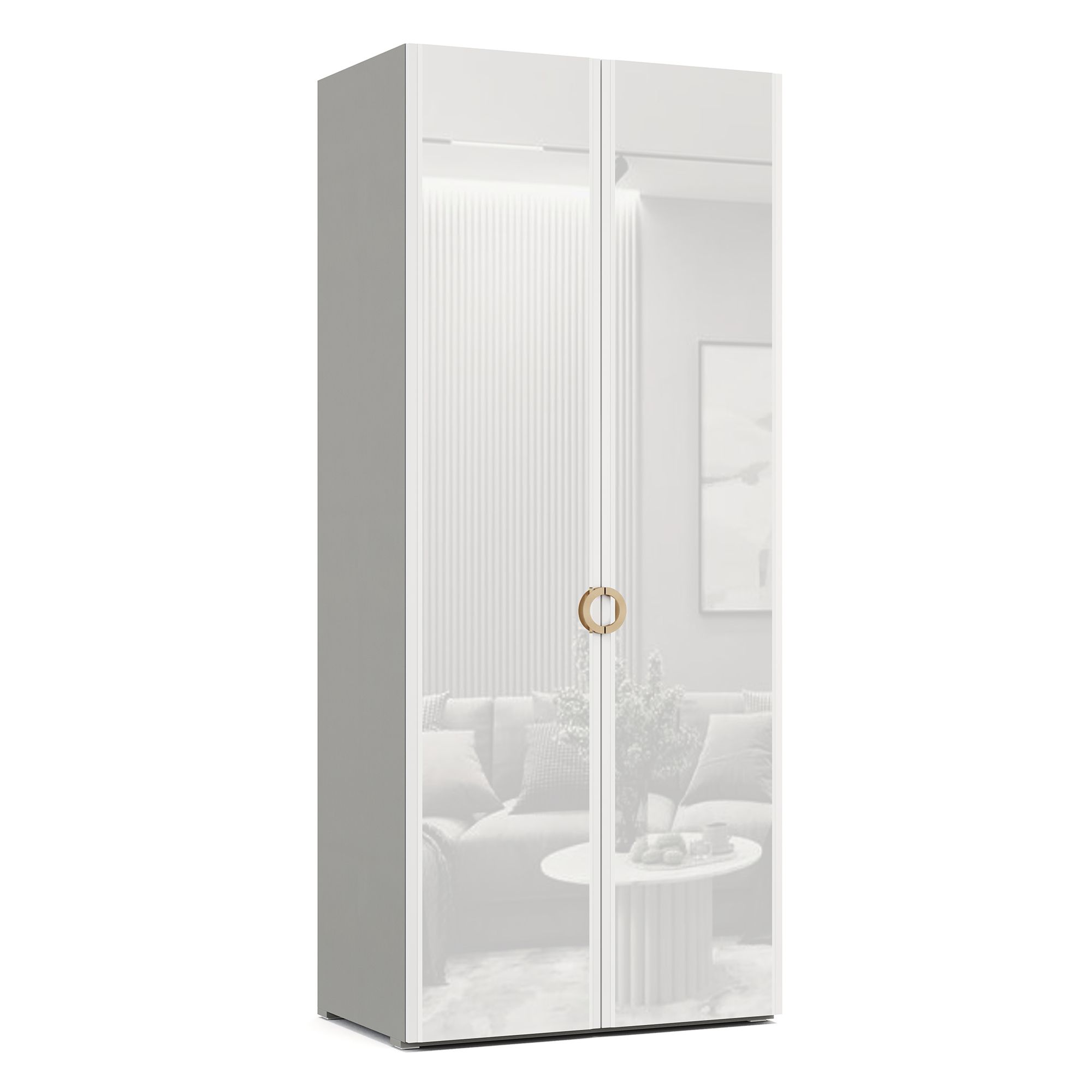 В верхней части двухдверного платяного шкафа TIARA расположены две полки, к нижней из которых крепится штанга для вешалок. Внешний и внутренний декор корпуса выполнен в текстуре Шенилл, повторяющей рисунок натуральной ткани. Зеркальные фасады модели оснащены ручками в отделке Матовое золото.
