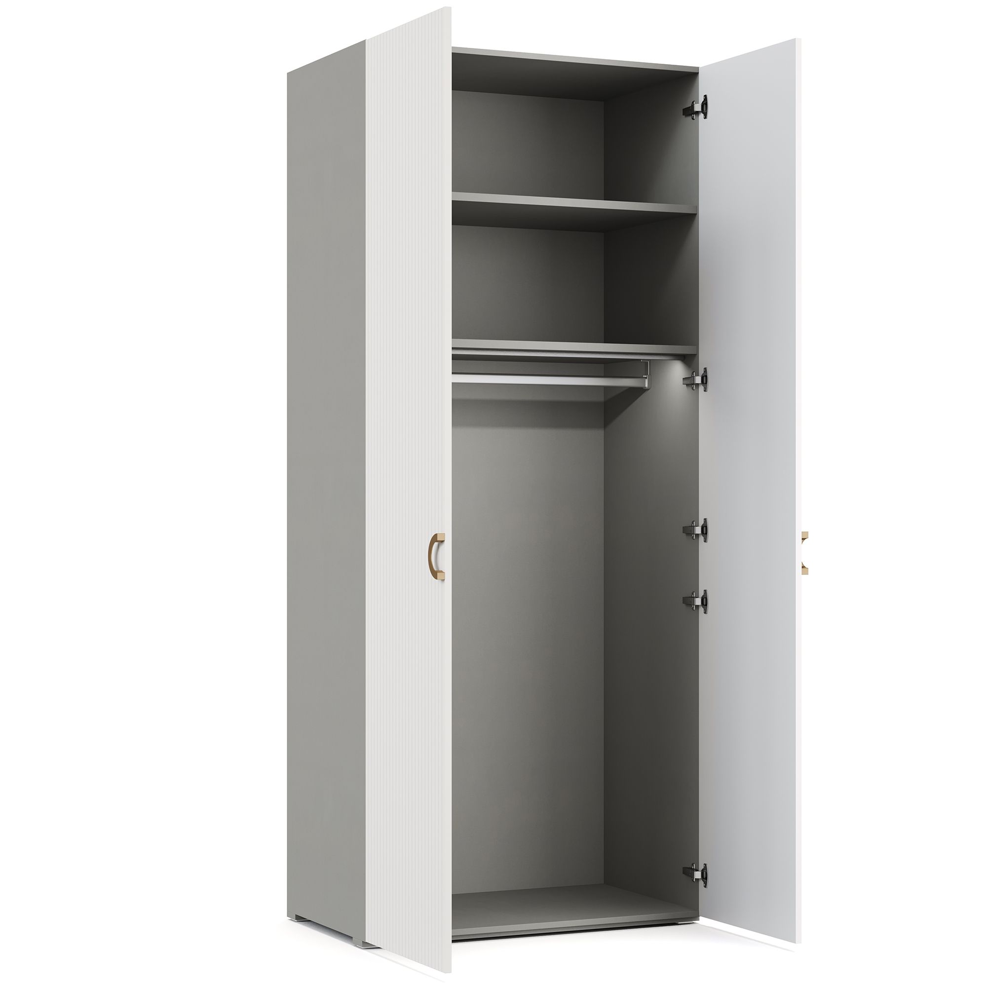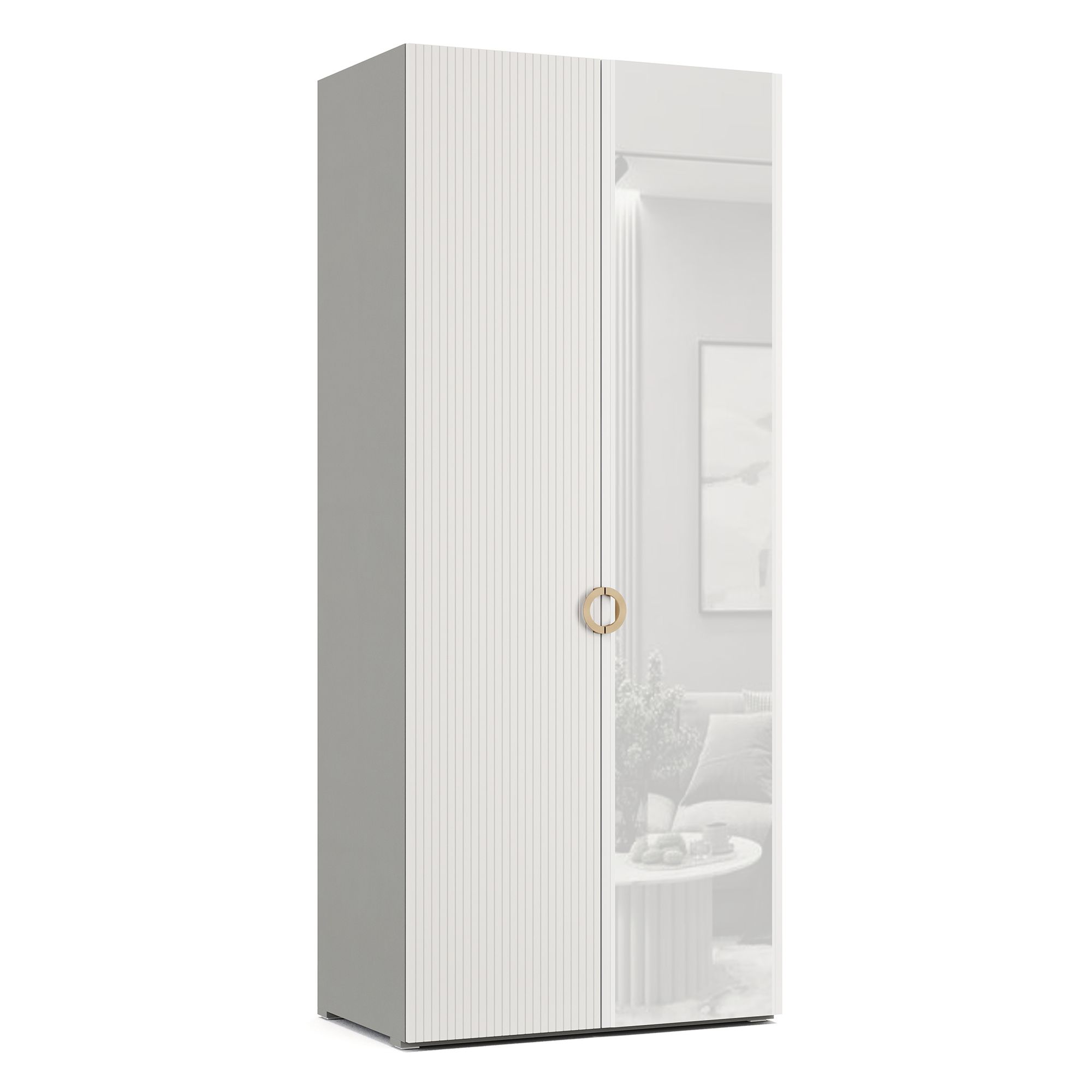 В верхней части двухдверного платяного шкафа TIARA расположены две полки, к нижней из которых крепится штанга для вешалок. Внешний и внутренний декор корпуса выполнен в текстуре Шенилл, повторяющей рисунок натуральной ткани. Один из фасадов модели представляет собой зеркало, второй выполнен в отделке эмалью, декорирован вертикальной фрезеровкой. Предусмотрены варианты как с правым, так и с левым расположением зеркального фасада. Акцентом служат ручки в отделке Матовое золото.