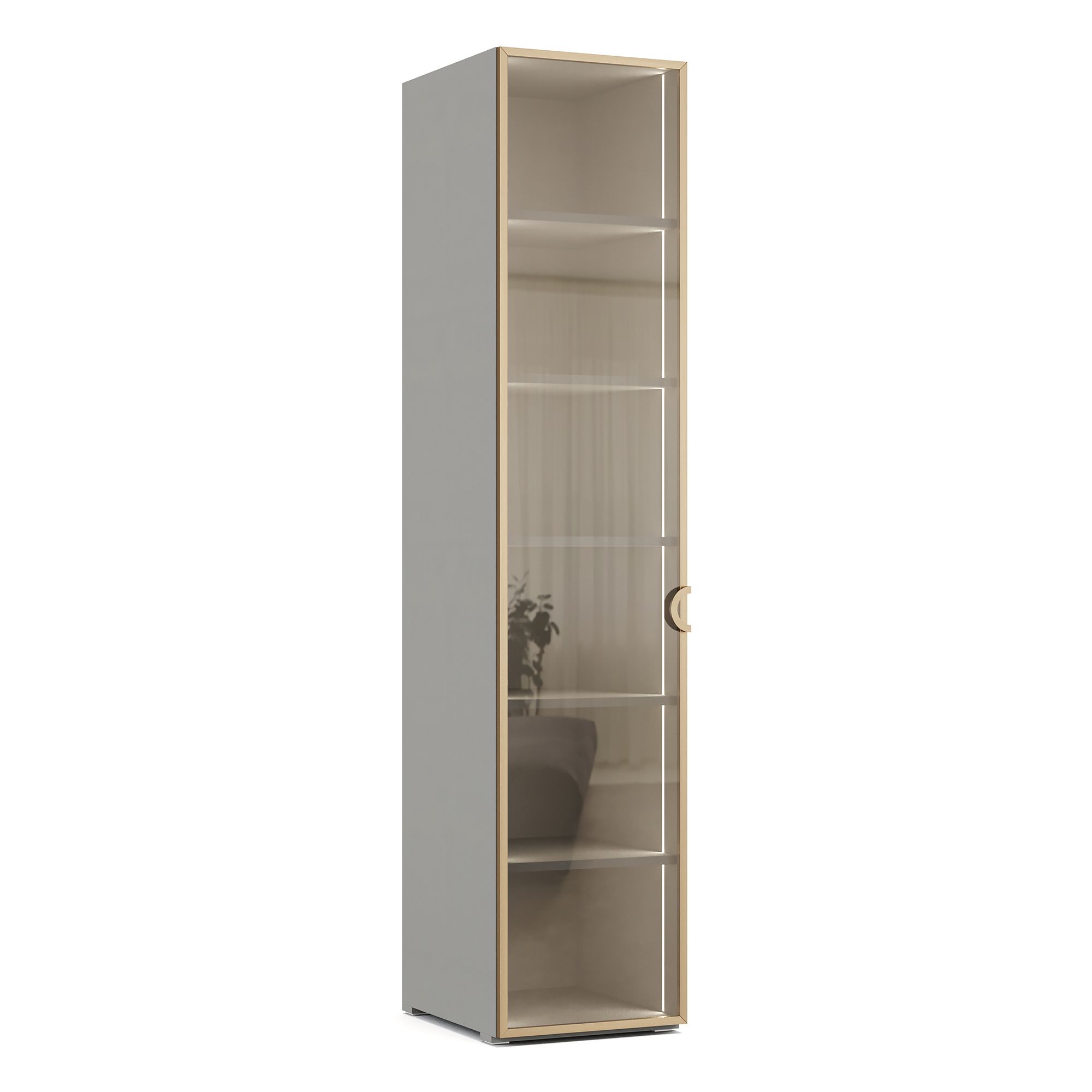 Внутреннее пространство однодверного платяного шкафа TIARA представляет собой систему полок из ЛДСП. Внешний и внутренний декор корпуса выполнен в текстуре Шенилл, повторяющей рисунок натуральной ткани. Фасад модели выполнен из стекла с зеркальным эффектом, тонированного в оттенок Бронза, и оснащен ручкой в отделке Матовое золото. Возможно как правое, так и левое открывание.